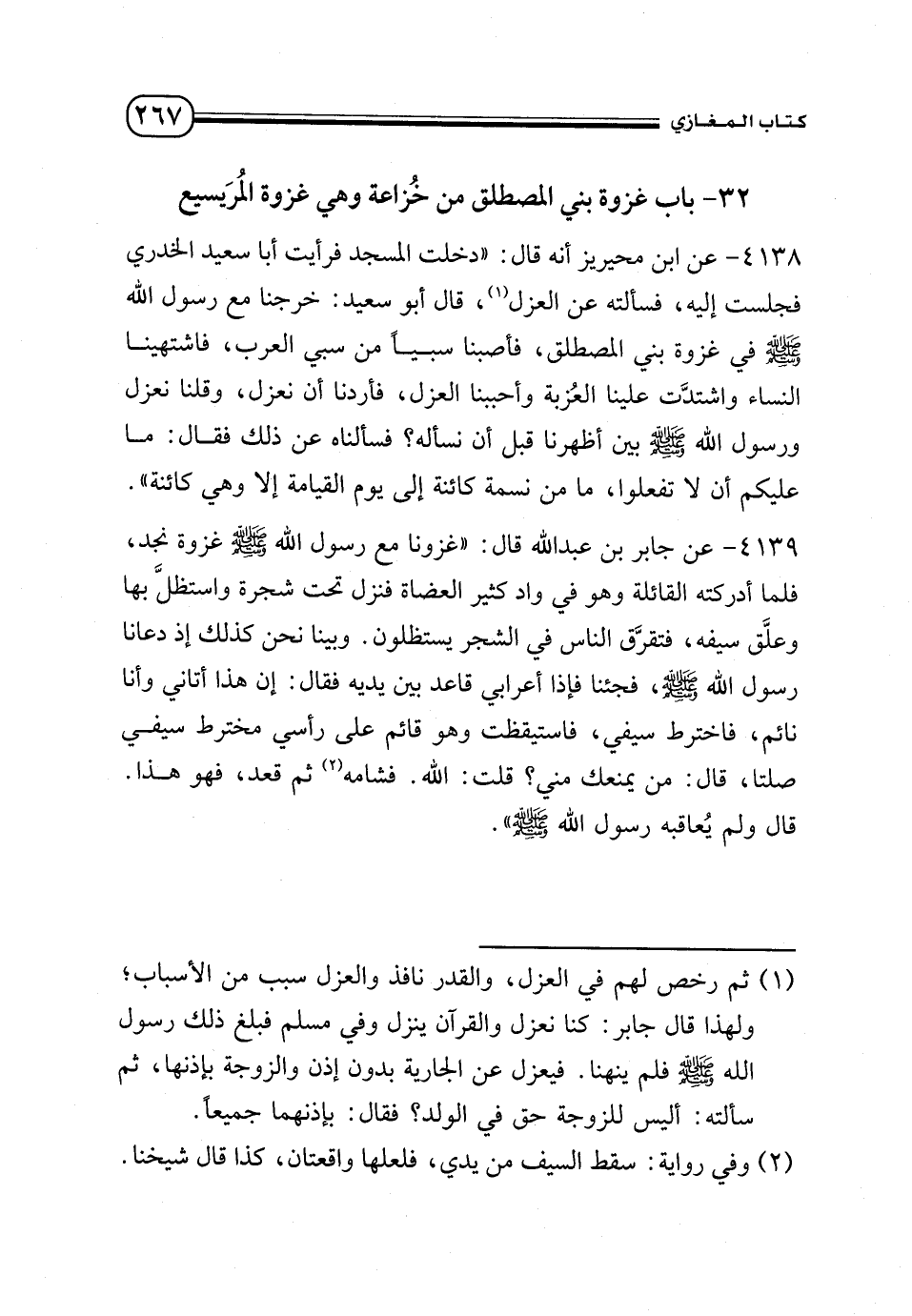 4138 - عن ابن محيريز أنه قال: «دخلت المسجد فرأيت أبا سعيد الخدري فجلست إليه، فسألته عن العزل (¬1)، قال أبو سعيد: خرجنا مع رسول الله - صلى الله عليه وسلم - في غزوة بني المصطلق، فأصبنا سبيًا من سبي العرب، فاشتهينا النساء واشتدَّت علينا العُزبة وأحببنا العزل، فأردنا أن نعزل، وقلنا نعزل ورسول الله - صلى الله عليه وسلم - بين أظهرنا قبل أن نسأله؟ فسألناه عن ذلك فقال: ما عليكم أن لا تفعلوا، ما من نسمة كائنة إلى يوم القيامة إلا وهي كائنة».