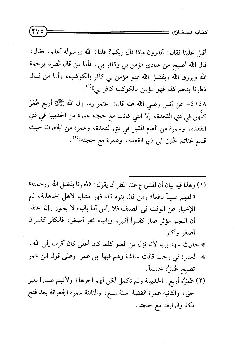 (¬1) وهذا فيه بيان أن المشروع عند المطر أن يقول: «مُطرنا بفضل الله ورحمته» «اللهم صيبًا نافعًا» ومن قال بنوء كذا فهو مشابه لأهل الجاهلية، ثم الإخبار عن الوقت في الصيف فلا بأس أما بالباء لا يجوز وإن اعتقد أن النجم مؤثر صار كفرًا أكبر، وبالباء كفر أصغر، فالكفر كفران أصغر وأكبر.