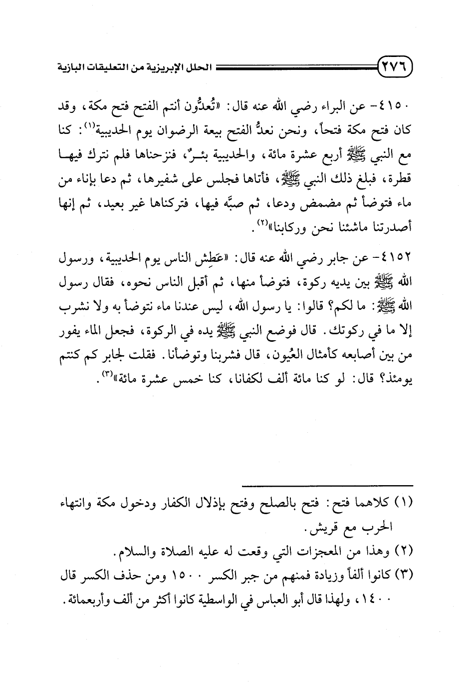 4150 - عن البراء - رضي الله عنه - قال: «تُعدُّون أنتم الفتح فتح مكة، وقد كان فتح مكة فتحًا، ونحن نعدُّ الفتح بيعة الرضوان يوم الحديبية (¬1): كنا مع النبي - صلى الله عليه وسلم - أربع عشرة مائة، والحديبية بئرٌ، فنزحناها فلم نترك فيها قطرة، فبلغ ذلك النبي - صلى الله عليه وسلم -، فأتاها فجلس على شفيرها، ثم دعا بإناء من ماء فتوضأ ثم مضمض ودعا، ثم صبَّه فيها، فتركناها غير بعيد، ثم إنها أصدرتنا ما شئنا نحن وركابنا» (¬2).