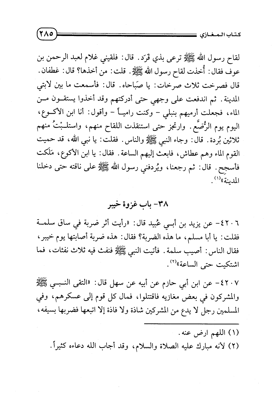 4206 - عن يزيد بن أبي عُبيد قال: «رأيت أثر ضربة في ساق سلمة فقلت: يا أبا مسلم، ما هذه الضربة؟ فقال: هذه ضربة أصابتها يوم خيبر، فقال الناس: أصيب سلمة. فأتيت النبي - صلى الله عليه وسلم - فنفث فيه ثلاث نفثات، فما اشتكيت حتى الساعة» (¬2).