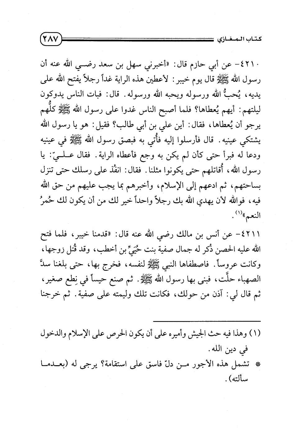 4210 - عن أبي حازم قال: «أخبرني سهل بن سعد - رضي الله عنه - أن رسول الله - صلى الله عليه وسلم - قال يوم خيبر: لأعطين هذه الراية غدًا رجلًا يفتح الله على يديه، يُحبُّ الله ورسوله ويحبه الله ورسوله. قال: فبات الناس يدوكون ليلتهم: أيهم يُعطاها؟ فلما أصبح الناس غدوا على رسول الله - صلى الله عليه وسلم - كلُّهم يرجو أن يُعطاها، فقال: أين علي بن أبي طالب؟ فقيل: هو يا رسول الله يشتكي عينيه. قال فأرسلوا إليه فأُتي به فبصق رسول الله - صلى الله عليه وسلم - في عينيه ودعا له فبرأ حتى كأن لم يكن به وجع فأعطاه الراية. فقال عليّ: يا رسول الله، أُقاتلهم حتى يكونوا مثلنا. فقال: انفُذ على رسلك حتى تنزل بساحتهم، ثم ادعهم إلى الإسلام، وأخبرهم بما يجب عليهم من حق الله فيه، فوالله لأن يهدي الله بك رجلًا واحدًا خير لك من أن يكون لك حُمرُ النعم» (¬1).