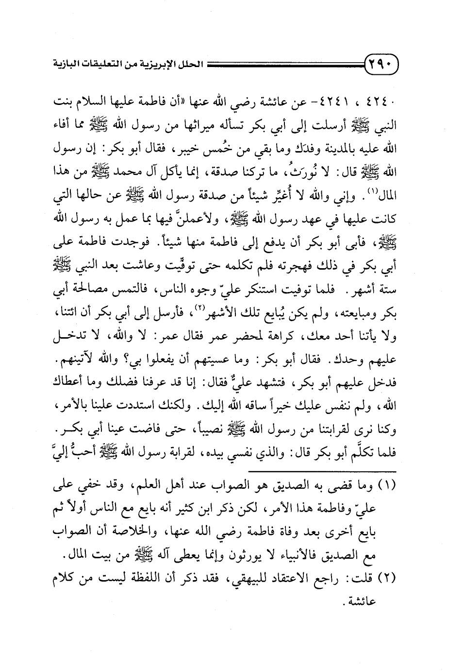 (¬1) وما قضى به الصديق هو الصواب عند أهل العلم، وقد خفي على عليّ وفاطمة هذا الأمر، لكن ذكر ابن كثير أنه بايع مع الناس أولًا ثم بايع أخرى بعد وفاة فاطمة - رضي الله عنها -، والخلاصة أن الصواب مع الصديق فالأنبياء لا يورثون وإنما يعطى آله - صلى الله عليه وسلم - من بيت المال.