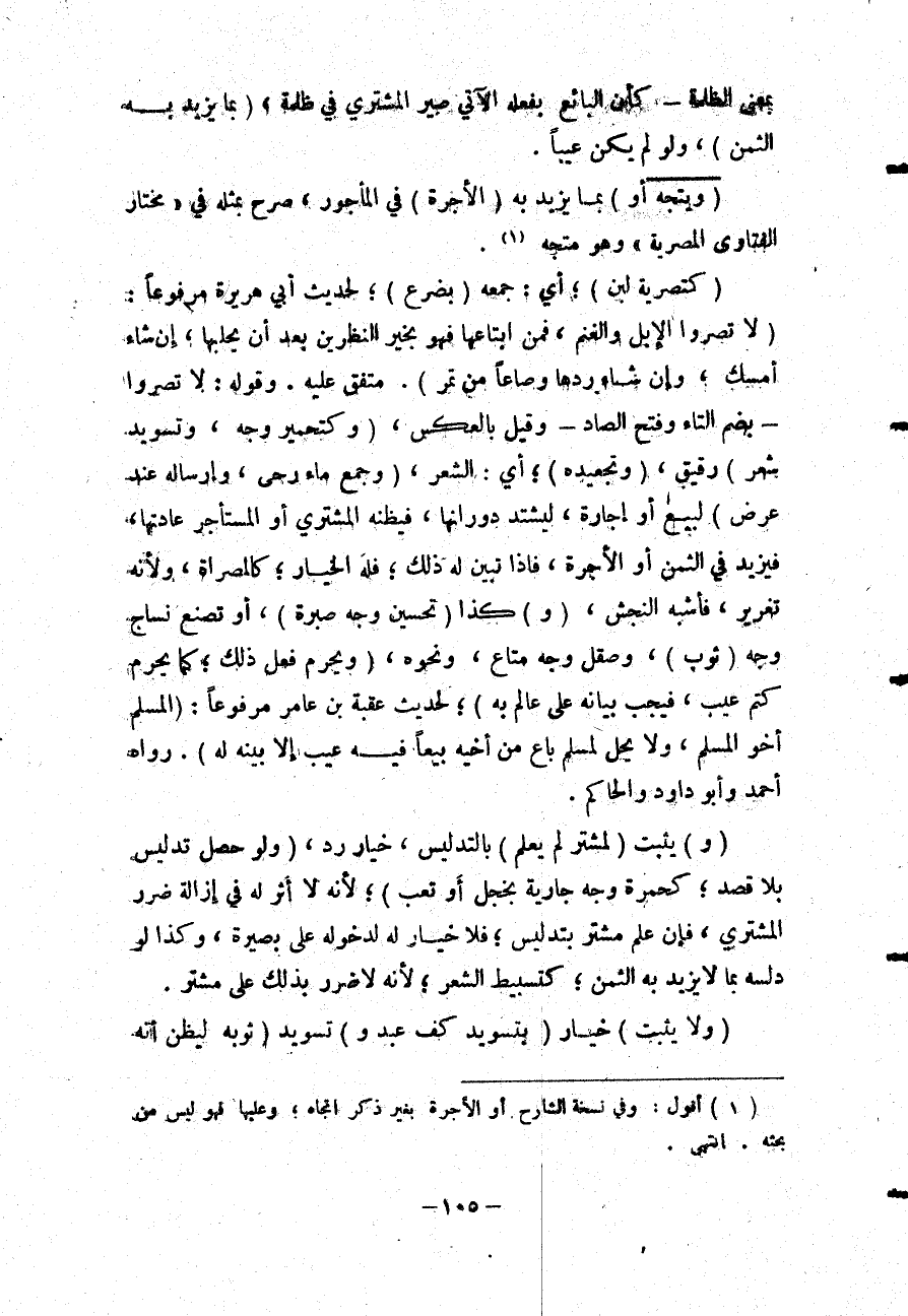 وَقَوْلُهُ: لَا تُصَرُّوا - بِضَمِّ التَّاءِ وَفَتْحِ الصَّادِ - وَقِيلَ بِالْعَكْسِ، (وَكَتَحْمِيرِ وَجْهٍ، وَتَسْوِيدِ شَعْرٍ) رَقِيقٍ، (وَتَجْعِيدِهِ) ؛ أَيْ: الشَّعْرِ، (وَجَمْعِ مَاءِ رَحًى، وَإِرْسَالِهِ عِنْدَ عَرْضٍ) لِبَيْعٍ أَوْ إجَارَةٍ، لِيَشْتَدَّ دَوَرَانُهَا، فَيَظُنُّهُ الْمُشْتَرِي أَوْ الْمُسْتَأْجِرُ عَادَتَهَا، فَيَزِيدُ فِي الثَّمَنِ أَوْ الْأُجْرَةِ، فَإِذَا تَبَيَّنَ لَهُ ذَلِكَ؛ فَلَهُ الْخِيَارُ؛ كَالْمُصَرَّاةِ، وَلِأَنَّهُ تَغْرِيرٌ، فَأَشْبَهَ النَّجْشَ، (وَ) كَذَا (تَحْسِينُ وَجْهِ صُبْرَةٍ) ، أَوْ تَصَنُّعُ نَسَّاجٍ وَجْهَ (ثَوْبٍ) ، وَصَقْلَ وَجْهِ مَتَاعٍ، وَنَحْوَهُ، (وَيَحْرُمُ فِعْلُ ذَلِكَ؛ كَمَا يَحْرُمُ كَتْمُ عَيْبٍ، فَيَجِبُ بَيَانُهُ عَلَى عَالِمٍ بِهِ) ؛ لِحَدِيثِ عُقْبَةَ بْنِ عَامِرٍ مَرْفُوعًا: «الْمُسْلِمُ أَخُو الْمُسْلِمِ، وَلَا يَحِلُّ لِمُسْلِمٍ بَاعَ مِنْ أَخِيهِ بَيْعًا فِيهِ عَيْبٌ إلَّا بَيَّنَهُ لَهُ» . رَوَاهُ أَحْمَدُ وَأَبُو دَاوُد وَالْحَاكِمُ.