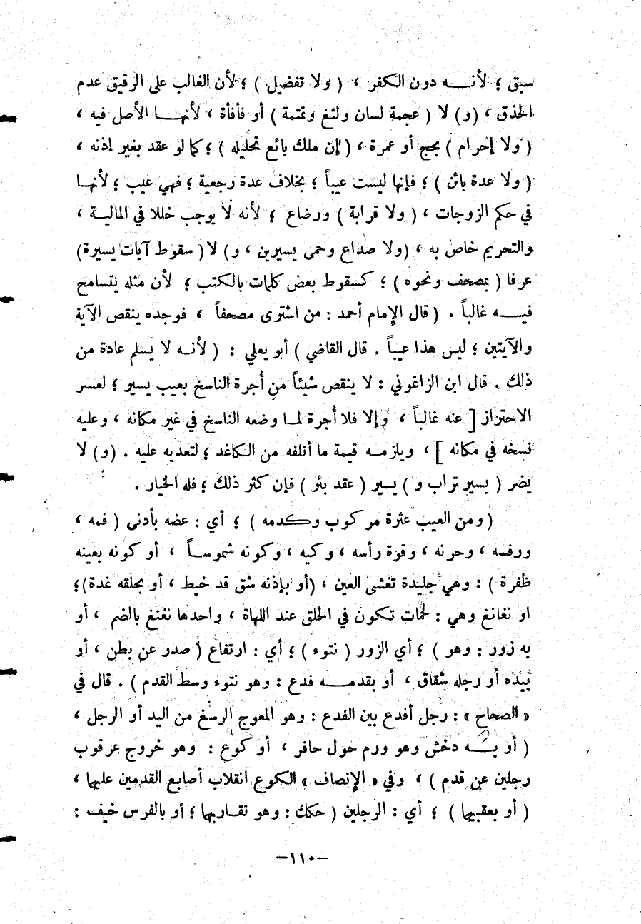 (قَالَ الْإِمَامُ أَحْمَدُ: مَنْ اشْتَرَى مُصْحَفًا، فَوَجَدَهُ يَنْقُصُ الْآيَةَ وَالْآيَتَيْنِ؛ لَيْسَ هَذَا عَيْبًا قَالَ الْقَاضِي) أَبُو يَعْلَى: (لِأَنَّهُ لَا يَسْلَمُ عَادَةً مِنْ ذَلِكَ) قَالَ ابْنُ الزَّاغُونِيِّ: لَا يُنْقِصُ شَيْئًا مِنْ أُجْرَةِ النَّاسِخِ بِعَيْبٍ يَسِيرٍ؛ لِعُسْرِ الِاحْتِرَازِ [عَنْهُ غَالِبًا، وَإِلَّا فَلَا أُجْرَةَ لِمَا وَضَعَهُ النَّاسِخُ فِي غَيْرِ مَكَانِهِ، وَعَلَيْهِ نَسْخُهُ فِي مَكَانِهِ] ، وَيَلْزَمُهُ قِيمَةُ مَا أَتْلَفَهُ مِنْ الْكَاغِدِ؛ لِتَعَدِّيهِ عَلَيْهِ.