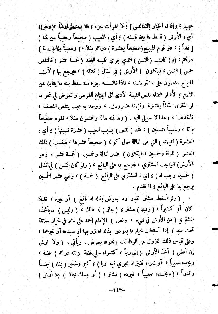 (وَمَا ثَمَنُهُ مِائَةٌ وَخَمْسُونَ مَثَلًا، فَقُوِّمَ صَحِيحًا بِمِائَةٍ، وَمَعِيبًا بِتِسْعِينَ) ، فَقَدْ (نَقَصَ) بِسَبَبِ الْعَيْبِ (عَشَرَةً نِسْبَتُهَا) ، أَيْ: الْعَشَرَةِ (لِقِيمَتِهِ) الَّتِي هِيَ الْمِائَةُ حَالَ كَوْنِهِ (صَحِيحًا عُشْرُهَا، فَيُنْسَبُ) ذَلِكَ الْعُشْرُ (لِلْمِائَةِ وَخَمْسِينَ، فَيَكُونُ) عُشْرُ الْمِائَةِ وَخَمْسِينَ (خَمْسَةَ عَشْرَ، وَهُوَ الْأَرْشُ) الْوَاجِبُ لِلْمُشْتَرِي، فَيَرْجِعُ بِهِ عَلَى الْبَائِعِ، (وَلَوْ كَانَ الثَّمَنُ) فِي الْمِثَالِ (خَمْسِينَ وَجَبَ لَهُ) ، أَيْ: لِلْمُشْتَرِي عَلَى الْبَائِعِ (خَمْسَةٌ) ، وَهِيَ عُشْرُ الْخَمْسِينَ يَرْجِعُ بِهَا عَلَى الْبَائِعِ، لَمَا تَقَدَّمَ.