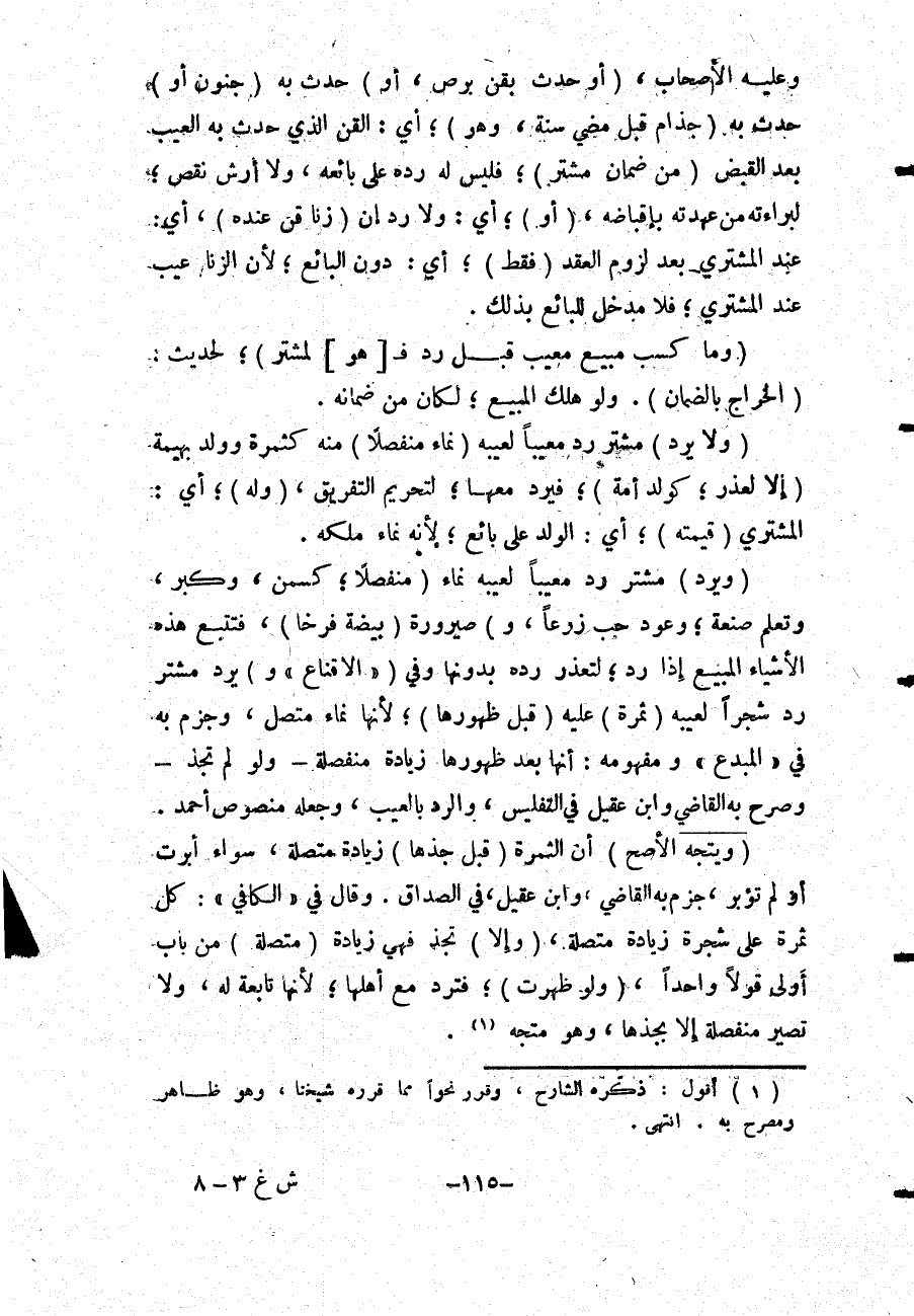 (وَيَرُدُّ) مُشْتَرٍ رَدَّ مَعِيبًا لِعَيْبِهِ نَمَاءً (مُتَّصِلًا، كَسِمَنٍ، وَكِبَرٍ، وَتَعَلُّمِ صَنْعَةٍ، وَعُودِ حَبٍّ زَرْعًا، وَ) صَيْرُورَةِ (بَيْضَةٍ فَرْخًا) فَتَتْبَعُ هَذِهِ الْأَشْيَاءُ الْمَبِيعَ إذَا رُدَّ، لِتَعَذُّرِ رَدِّهِ بِدُونِهَا. وَفِي (" الْإِقْنَاعِ " وَ) يَرُدُّ مُشْتَرٍ رَدَّ شَجَرًا لِعَيْبِهِ (ثَمَرَةً) عَلَيْهِ (قَبْلَ ظُهُورِهَا) ؛ لِأَنَّهَا نَمَاءٌ مُتَّصِلٌ، وَجَزَمَ بِهِ فِي " الْمُبْدِعِ " وَمَفْهُومُهُ: أَنَّهَا بَعْدَ ظُهُورِهَا زِيَادَةً مُنْفَصِلَةً - وَلَوْ لَمْ تُجَذَّ - وَصَرَّحَ بِهِ الْقَاضِي وَابْنُ عَقِيلٍ فِي التَّفْلِيسِ، وَالرَّدِّ بِالْعَيْبِ، وَجَعَلَهُ مَنْصُوصَ أَحْمَدَ.
