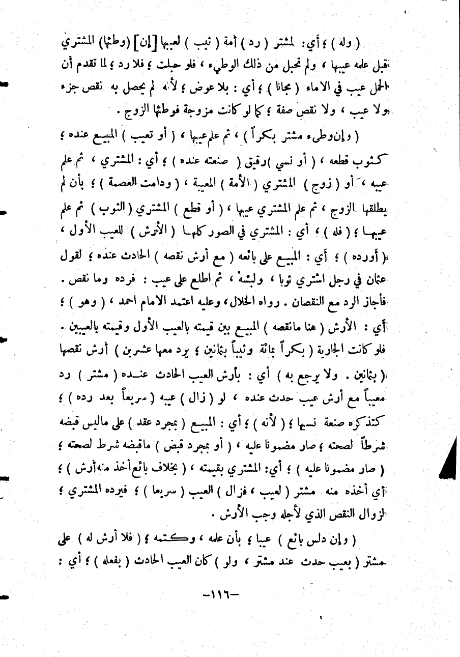 (وَإِنْ وَطِئَ مُشْتَرٍ بِكْرًا) ، ثُمَّ عَلِمَ عَيْبَهَا، (أَوْ تَعَيَّبَ) الْمَبِيعُ عِنْدَهُ، كَثَوْبٍ قَطَعَهُ، (أَوْ نَسِيَ) رَقِيقٌ (صَنْعَتَهُ عِنْدَهُ) ، أَيْ: الْمُشْتَرِي، ثُمَّ عَلِمَ عَيْبَهُ، أَوْ (زَوَّجَ) الْمُشْتَرِي (الْأَمَةَ) الْمَعِيبَةَ، (وَدَامَتْ الْعِصْمَةُ) ، بِأَنْ لَمْ يُطَلِّقْهَا الزَّوْجُ، ثُمَّ عَلِمَ الْمُشْتَرِي عَيْبَهَا، (أَوْ قَطَعَ) الْمُشْتَرِي (الثَّوْبَ) ثُمَّ عَلِمَ عَيْبَهَا، (فَلَهُ) ، أَيْ: الْمُشْتَرِي فِي الصُّوَرِ كُلِّهَا (الْأَرْشُ) لِلْعَيْبِ الْأَوَّلِ، (أَوْ رَدُّهُ) ، أَيْ: الْمَبِيعِ عَلَى بَائِعِهِ (مَعَ أَرْشِ نَقْصِهِ) الْحَادِثِ عِنْدَهُ لِقَوْلِ عُثْمَانَ فِي رَجُلٍ اشْتَرَى ثَوْبًا، وَلَبِسَهُ، ثُمَّ اطَّلَعَ عَلَى عَيْبٍ: فَرَدَّهُ وَمَا نَقَصَ. فَأَجَازَ الرَّدَّ مَعَ النُّقْصَانِ. رَوَاهُ الْخَلَّالُ، وَعَلَيْهِ اعْتَمَدَ الْإِمَامُ أَحْمَدُ، (وَهُوَ) ، أَيْ: الْأَرْشُ (هُنَا مَا نَقَصَهُ) الْمَبِيعُ بَيْنَ قِيمَتِهِ بِالْعَيْبِ الْأَوَّلِ وَقِيمَتِهِ بِالْعَيْبَيْنِ. فَلَوْ كَانَتْ الْجَارِيَةُ (بِكْرًا بِمِائَةٍ وَثَيِّبًا بِثَمَانِينَ، يَرُدُّ مَعَهَا عِشْرِينَ) أَرْشَ نَقْصِهَا (بِثَمَانِينَ وَلَا يَرْجِعُ بِهِ) أَيْ: بِأَرْشِ الْعَيْبِ الْحَادِثِ عِنْدَهُ (مُشْتَرٍ) رَدَّ مَعِيبًا مَعَ أَرْشِ عَيْبٍ حَدَثَ عِنْدَهُ، لَوْ (زَالَ) عَيْبُهُ (سَرِيعًا بَعْدَ رَدِّهِ) ، كَتَذَكُّرِهِ صَنْعَةً نَسِيَهَا (لِأَنَّهُ) ، أَيْ: الْمَبِيعَ (بِمُجَرَّدِ عَقْدٍ) عَلَى مَا لَيْسَ قَبْضُهُ شَرْطًا لِصِحَّتِهِ، صَارَ مَضْمُونًا عَلَيْهِ، (أَوْ بِمُجَرَّدِ قَبْضِ) مَا قَبَضَهُ شَرْطٌ لِصِحَّتِهِ، (صَارَ مَضْمُونًا عَلَيْهِ) ، أَيْ: الْمُشْتَرِي بِقِيمَتِهِ، (بِخِلَافِ بَائِعٍ أُخِذَ مِنْهُ أَرْشٌ) ، أَيْ أَخَذَهُ مِنْهُ مُشْتَرٍ (لِعَيْبٍ، فَزَالَ) الْعَيْبُ (سَرِيعًا) ، فَيَرُدُّهُ الْمُشْتَرِي، لِزَوَالِ النَّقْصِ الَّذِي لِأَجْلِهِ وَجَبَ الْأَرْشُ.