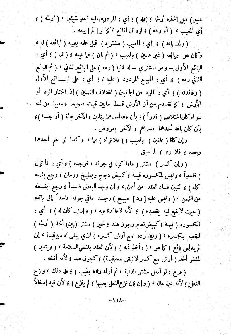 (وَإِنْ بَاعَهُ) ، أَيْ: الْمَعِيبَ (مُشْتَرِيهِ) قَبْلَ عِلْمِهِ بِعَيْبِهِ (لِبَائِعِهِ) لَهُ، وَكَانَ هُوَ وَبَائِعُهُ (غَيْرَ عَالِمَيْنِ) بِالْعَيْبِ، (ثُمَّ بَانَ) لَهُمَا عَيْبُهُ، (فَلَهُ) ، أَيْ: الْبَائِعِ الْأَوَّلِ - وَهُوَ الْمُشْتَرِي - لَهُ ثَانِيًا (رَدُّهُ) عَلَى الْبَائِعِ الثَّانِي، (ثُمَّ لِلْبَائِعِ الثَّانِي رَدُّهُ) ، أَيْ: الْمَبِيعِ الْمَرْدُودِ (عَلَيْهِ) ، أَيْ: عَلَى الْبَائِعِ الْأَوَّلِ (وَفَائِدَتُهُ) ، أَيْ: الرَّدِّ مِنْ الْجَانِبَيْنِ (اخْتِلَافُ الثَّمَنَيْنِ) إذْ اخْتَارَ الرَّدَّ أَوْ الْأَرْشَ، كَمَا تَقَدَّمَ مِنْ أَنَّ الْأَرْشَ قِسْطُ مَا بَيْنَ قِيمَتِهِ صَحِيحًا وَمَعِيبًا مِنْ ثَمَنِهِ سَوَاءٌ كَانَ اخْتِلَافُهُمَا (قَدْرًا) ، بِأَنْ بَاعَهُ أَحَدُهُمَا بِثَمَانِينَ وَالْآخَرُ بِمِائَةٍ (أَوْ جِنْسًا) ، بِأَنْ كَانَ بَاعَهُ أَحَدُهُمَا بِدَرَاهِمَ وَالْآخَرُ بِعُرُوضٍ. وَإِنْ كَانَا (عَالِمَيْنِ) بِالْعَيْبِ، (فَلَا تَرَادَّ) لَهُمَا، وَكَذَا لَوْ عَلِمَ أَحَدُهُمَا وَحْدَهُ، فَلَا رَدَّ، لِمَا سَبَقَ.