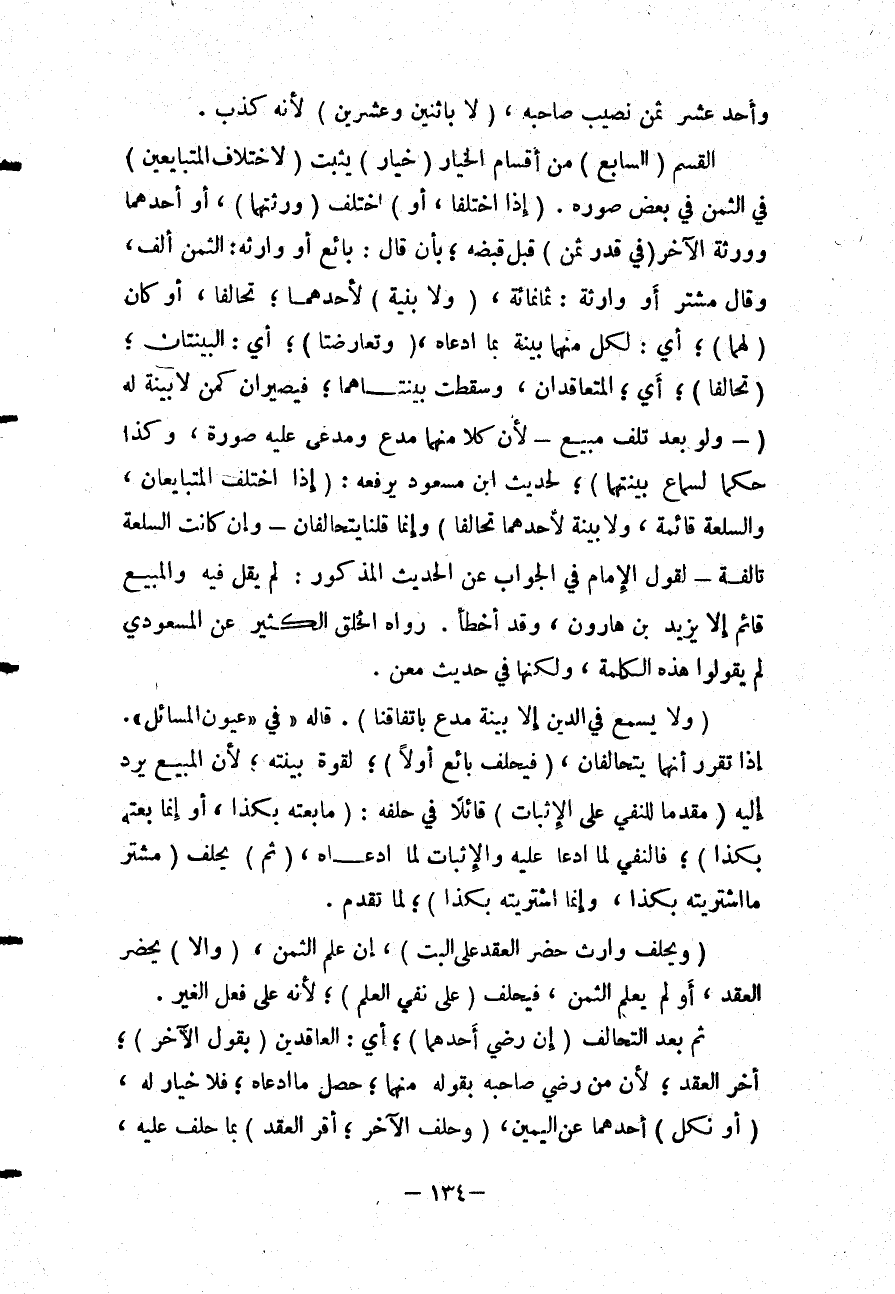 الْقِسْمُ (السَّابِعُ) مِنْ أَقْسَامِ الْخِيَارِ (خِيَارٌ) يَثْبُتُ (لِاخْتِلَافِ الْمُتَبَايِعِينَ) فِي الثَّمَنِ فِي بَعْضِ صُوَرِهِ. (إذَا) (اخْتَلَفَا، أَوْ) اخْتَلَفَ (وَرَثَتُهُمَا) ، أَوْ أَحَدُهُمَا وَوَرَثَةُ الْآخَرِ (فِي قَدْرِ ثَمَنٍ) قَبْلَ قَبْضِهِ، بِأَنْ قَالَ: بَائِعٌ أَوْ وَارِثُهُ: الثَّمَنُ أَلْفٌ، وَقَالَ مُشْتَرٍ أَوْ وَارِثُهُ: ثَمَانِمِائَةٍ، (وَلَا بَيِّنَةَ) لِأَحَدِهِمَا، تَحَالَفَا، أَوْ كَانَ (لَهُمَا) ، أَيْ: لِكُلٍّ مِنْهُمَا بَيِّنَةٌ بِمَا ادَّعَاهُ، (وَتَعَارَضَتَا) ، أَيْ: الْبَيِّنَتَانِ، (تَحَالَفَا) ، أَيْ، الْمُتَعَاقِدَانِ، وَسَقَطَتْ بَيِّنَتَاهُمَا، فَيَصِيرَانِ كَمَنْ لَا بَيِّنَةَ لَهُ (- وَلَوْ بَعْدَ تَلَفِ مَبِيعٍ -؛ لِأَنَّ كُلًّا مِنْهُمَا مُدَّعٍ وَمُدَّعًى عَلَيْهِ صُورَةً، وَكَذَا حُكْمًا لِسَمَاعِ بَيِّنَتِهِمَا) ، لِحَدِيثِ ابْنِ مَسْعُودٍ يَرْفَعُهُ: «إذَا اخْتَلَفَ الْمُتَبَايِعَانِ، وَالسِّلْعَةُ قَائِمَةٌ، وَلَا بَيِّنَةَ لِأَحَدِهِمَا تَحَالَفَا» ) وَإِنَّمَا قُلْنَا يَتَحَالَفَانِ - وَإِنْ كَانَتْ السِّلْعَةُ تَالِفَةً - لِقَوْلِ الْإِمَامِ فِي الْجَوَابِ عَنْ الْحَدِيثِ الْمَذْكُورِ: لَمْ يَقُلْ فِيهِ وَالْمَبِيعُ قَائِمٌ إلَّا يَزِيدُ بْنُ هَارُونَ، وَقَدْ أَخْطَأَ. رَوَاهُ الْخَلْقُ الْكَثِيرُ عَنْ الْمَسْعُودِيِّ لَمْ يَقُولُوا هَذِهِ الْكَلِمَةَ، وَلَكِنَّهَا فِي حَدِيثِ مَعْنٍ.