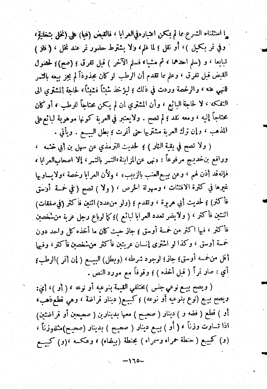 مَا اسْتَثْنَاهُ الشَّرْعُ مِمَّا لَمْ يُمْكِنْ اعْتِبَارُهُ فِي الْعَرَايَا، فَالْقَبْضُ (فِيمَا) عَلَى (نَخْلٍ بِتَخْلِيَةٍ، وَفِي تَمْرٍ بِكَيْلٍ) ، أَوْ نَقْلٍ، لِمَا عُلِمَ، وَلَا يُشْتَرَطُ حُضُورُ تَمْرٍ عِنْدَ نَخْلٍ، (فَلَوْ) تَبَايَعَا، وَ (سَلَّمَ أَحَدُهُمَا، ثُمَّ مَشَيَا، فَسَلَّمَ الْآخَرُ) قَبْلَ تَفَرُّقٍ، (صَحَّ) ، لِحُصُولِ الْقَبْضِ قَبْلَ تَفَرُّقٍ، وَعُلِمَ مِمَّا تَقَدَّمَ أَنَّ الرُّطَبَ لَوْ كَانَ مَجْذُوذًا لَمْ يَجُزْ بَيْعُهُ بِالتَّمْرِ لِلنَّهْيِ عَنْهُ، وَالرُّخْصَةُ وَرَدَتْ فِي ذَلِكَ، لِيُؤْخَذَ شَيْئًا فَشَيْئًا، لِحَاجَةِ الْمُشْتَرِي إلَى التَّفَكُّهِ، لَا لِحَاجَةِ الْبَائِعِ، وَأَنَّ الْمُشْتَرِيَ إنْ لَمْ يَكُنْ مُحْتَاجًا لِلرُّطَبِ، أَوْ كَانَ مُحْتَاجًا إلَيْهِ، وَمَعَهُ نَقْدٌ، لَمْ تَصِحَّ. وَلَا يُعْتَبَرُ فِي الْعَرِيَّةِ كَوْنُهَا مَوْهُوبَةً لِبَائِعٍ عَلَى الْمَذْهَبِ، وَإِنْ تَرَكَ الْعَرِيَّةَ مُشْتَرِيهَا حَتَّى أَتْمَرَتْ، بَطَلَ الْبَيْعُ، وَيَأْتِي.