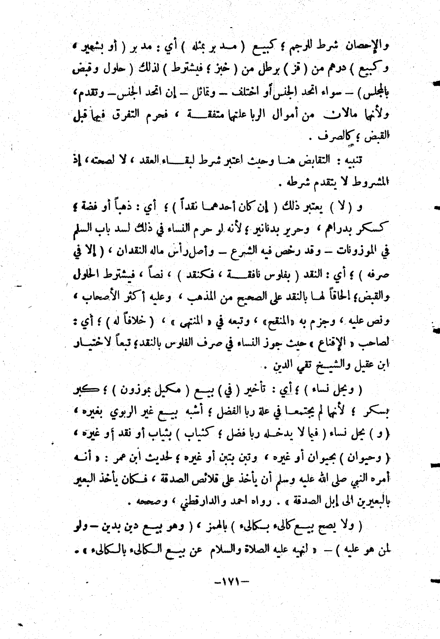 وَالْإِحْصَانُ شَرْطٌ لِلرَّجْمِ، كَبَيْعِ (مُدِّ بُرٍّ بِمِثْلِهِ) أَيْ: مُدِّ بُرٍّ (أَوْ بِشَعِيرٍ وَكَبَيْعِ) دِرْهَمٍ مِنْ (قَزٍّ) بِرَطْلٍ مِنْ (خُبْزٍ، فَيُشْتَرَطُ) لِذَلِكَ (حُلُولٌ وَقَبْضٌ بِالْمَجْلِسِ) - سَوَاءٌ اتَّحَدَ الْجِنْسُ أَوْ اخْتَلَفَ - وَتَمَاثَلَ - إنْ اتَّحَدَ الْجِنْسُ - وَتَقَدَّمَ، وَلِأَنَّهُمَا مَالَانِ مِنْ أَمْوَالِ الرِّبَا عِلَّتُهُمَا مُتَّفِقَةٌ، فَحَرُمَ التَّفَرُّقُ فِيهِمَا قَبْلَ الْقَبْضِ، كَالصَّرْفِ.