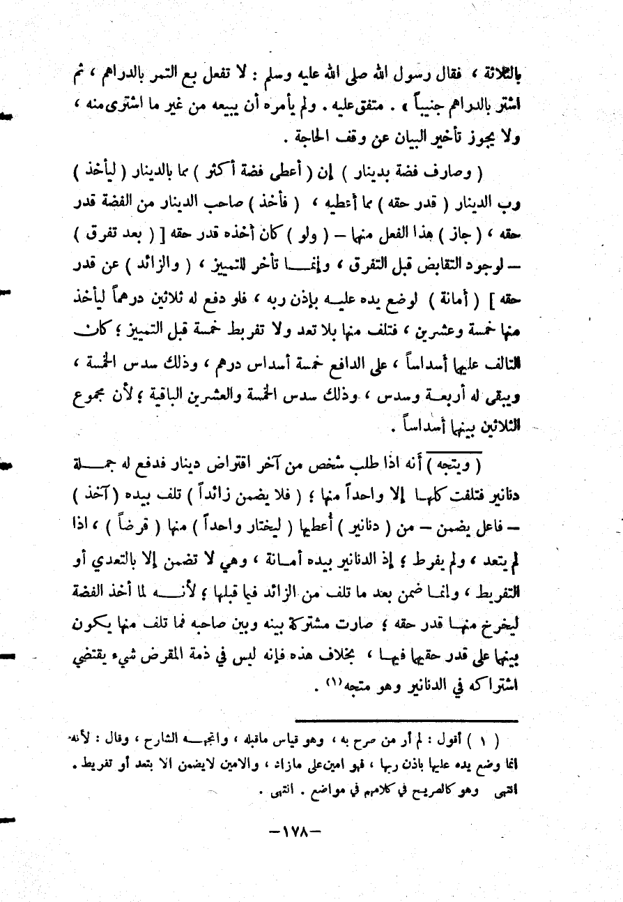 (وَصَارِفُ فِضَّةٍ بِدِينَارٍ) إنْ (أَعْطَى فِضَّةً أَكْثَرَ) مِمَّا بِالدِّينَارِ (لِيَأْخُذَ) رَبُّ الدِّينَارِ (قَدْرَ حَقِّهِ) مِمَّا أُعْطِيَهُ، (فَأَخَذَ) صَاحِبُ الدِّينَارِ مِنْ الْفِضَّةِ قَدْرَ حَقِّهِ، (جَازَ) هَذَا الْفِعْلُ مِنْهُمَا - (وَلَوْ) كَانَ أَخْذُهُ قَدْرَ حَقِّهِ (بَعْدَ تَفَرُّقٍ) - لِوُجُودِ التَّقَابُضِ قَبْلَ التَّفَرُّقِ، وَإِنَّمَا تَأَخَّرَ لِلتَّمْيِيزِ، (وَالزَّائِدُ) عَنْ قَدْرِ حَقِّهِ (أَمَانَةٌ) لِوَضْعِ يَدِهِ عَلَيْهِ بِإِذْنِ رَبِّهِ، فَلَوْ دَفَعَ لَهُ ثَلَاثِينَ دِرْهَمًا لِيَأْخُذَ مِنْهَا خَمْسَةً وَعِشْرِينَ، فَتَلِفَ مِنْهَا بِلَا تَعَدٍّ وَلَا تَفْرِيطٍ خَمْسَةٌ قَبْلَ التَّمْيِيزِ، كَانَ التَّالِفُ عَلَيْهِمَا أَسْدَاسًا، عَلَى الدَّافِعِ خَمْسَةُ أَسْدَاسٍ دِرْهَمٍ، وَذَلِكَ سُدُسُ الْخَمْسَةِ، وَيَبْقَى لَهُ أَرْبَعَةٌ وَسُدُسٌ، وَذَلِكَ سُدُسُ الْخَمْسَةِ وَالْعِشْرِينَ الْبَاقِيَةِ؛ لِأَنَّ مَجْمُوعَ الثَّلَاثِينَ بَيْنَهُمَا أَسْدَاسًا. (وَيَتَّجِهُ) أَنَّهُ إذَا طَلَبَ شَخْصٌ مِنْ آخَرَ اقْتِرَاضَ دِينَارٍ فَدَفَعَ لَهُ جُمْلَةَ دَنَانِيرَ فَتَلِفَتْ كُلُّهَا إلَّا وَاحِدًا مِنْهَا، (فَلَا يَضْمَنُ زَائِدًا) تَلِفَ بِيَدِهِ (آخِذٌ) - فَاعِلُ يَضْمَنُ - مِنْ (دَنَانِيرَ) أُعْطِيَهَا (لِيَخْتَارَ وَاحِدًا) مِنْهَا (قَرْضًا) ، إذَا لَمْ يَتَعَدَّ، وَلَمْ يُفَرِّطْ، إذْ الدَّنَانِيرُ بِيَدِهِ أَمَانَةٌ، وَهِيَ لَا تُضْمَنْ إلَّا بِالتَّعَدِّي أَوْ التَّفْرِيطِ، وَإِنَّمَا ضَمِنَ بَعْدَمَا تَلِفَ مِنْ الزَّائِدِ فِيمَا قَبْلَهَا؛ لِأَنَّهُ لَمَّا أَخَذَ الْفِضَّةَ لِيُخْرِجَ مِنْهَا قَدْرَ حَقِّهِ، صَارَتْ مُشْتَرَكَةً بَيْنَهُ وَبَيْنَ صَاحِبِهِ فَمَا تَلِفَ مِنْهَا يَكُونُ بَيْنَهُمَا عَلَى قَدْرِ حَقَّيْهِمَا فِيهَا، بِخِلَافِ هَذِهِ فَإِنَّهُ لَيْسَ فِي ذِمَّةِ الْمُقْرِضِ شَيْءٌ يَقْتَضِي اشْتِرَاكَهُ فِي الدَّنَانِيرِ وَهُوَ مُتَّجِهٌ.