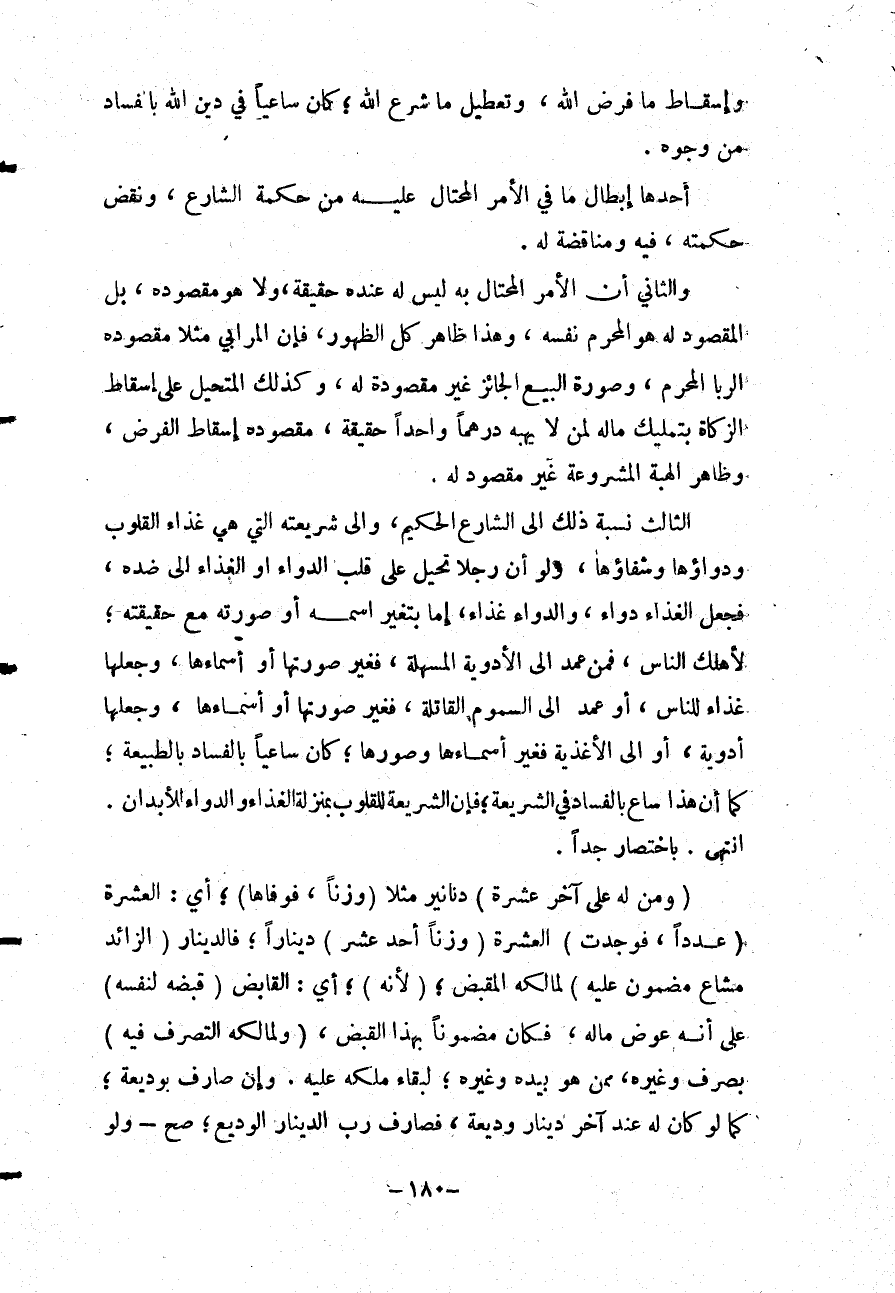 وَإِسْقَاطَ مَا فَرَضَ اللَّهُ، وَتَعْطِيلَ مَا شَرَعَ اللَّهُ، كَانَ سَاعِيًا فِي دِينِ اللَّهِ بِإِفْسَادٍ مِنْ وُجُوهٍ: أَحَدُهَا: إبْطَالُ مَا فِي الْأَمْرِ الْمُحْتَالِ عَلَيْهِ مِنْ حِكْمَةِ الشَّارِعِ، وَنَقْضِ حِكْمَتِهِ، فِيهِ وَمُنَاقَضَةٍ لَهُ. وَالثَّانِي أَنَّ الْأَمْرَ الْمُحْتَالَ بِهِ لَيْسَ لَهُ عِنْدَهُ حَقِيقَةٌ، وَلَا هُوَ مَقْصُودَهُ، بَلْ الْمَقْصُودُ لَهُ هُوَ الْمُحَرَّمُ نَفْسُهُ، وَهَذَا ظَاهِرٌ كُلَّ الظُّهُورِ، فَإِنَّ الْمُرَابِيَ مَثَلًا مَقْصُودُهُ الرِّبَا الْمُحَرَّمُ، وَصُورَةُ الْبَيْعِ الْجَائِزِ غَيْرُ مَقْصُودَةٍ لَهُ، وَكَذَلِكَ الْمُتَحَيِّلُ عَلَى إسْقَاطِ الزَّكَاةِ بِتَمْلِيكِ مَالِهِ لِمَنْ لَا يَهَبُهُ دِرْهَمًا وَاحِدًا حَقِيقَةً، مَقْصُودُهُ إسْقَاطُ الْفَرْضِ، وَظَاهِرُ الْهِبَةِ الْمَشْرُوعَةِ غَيْرُ مَقْصُودٍ لَهُ. الثَّالِثُ: نِسْبَةُ ذَلِكَ إلَى الشَّارِعِ الْحَكِيمِ، وَإِلَى شَرِيعَتِهِ الَّتِي هِيَ غِذَاءُ الْقُلُوبِ وَدَوَاؤُهَا وَشِفَاؤُهَا، وَلَوْ أَنَّ رَجُلًا تَحَيَّلَ عَلَى قَلْبِ الدَّوَاءِ أَوْ الْغِذَاءِ إلَى ضِدِّهِ، فَجَعَلَ الْغِذَاءَ دَوَاءً، وَالدَّوَاءَ غِذَاءً، إمَّا بِتَغَيُّرِ اسْمِهِ أَوْ صُورَتِهِ مَعَ حَقِيقَتِهِ، لَأَهْلَكَ النَّاسَ، فَمَنْ عَمَدَ إلَى الْأَدْوِيَةِ الْمُسَهِّلَةِ، فَغَيَّرَ صُورَتَهَا أَوْ أَسْمَاءَهَا، وَجَعَلَهَا غِذَاءً لِلنَّاسِ، أَوْ عَمَدَ إلَى السُّمُومِ الْقَاتِلَةِ، فَغَيَّرَ صُورَتَهَا أَوْ أَسْمَاءَهَا، وَجَعَلَهَا أَدْوِيَةً، أَوْ إلَى الْأَغْذِيَةِ فَغَيَّرَ أَسْمَاءَهَا وَصُوَرَهَا، كَانَ سَاعِيًا بِالْفَسَادِ بِالطَّبِيعَةِ، كَمَا أَنَّ هَذَا سَاعٍ بِالْفَسَادِ فِي الشَّرِيعَةِ، فَإِنَّ الشَّرِيعَةَ لِلْقُلُوبِ بِمَنْزِلَةِ الْغِذَاءِ وَالدَّوَاءِ لَلْأَبَدَانِ، انْتَهَى بِاخْتِصَارٍ جِدًّا