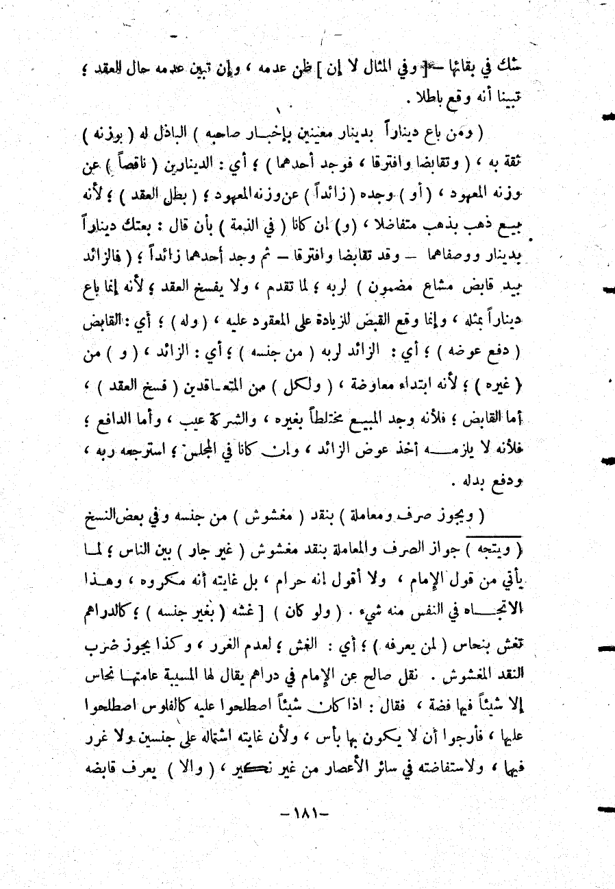 (وَيَجُوزُ صَرْفٌ وَمُعَامَلَةٌ) بِنَقْدٍ (مَغْشُوشٍ) مِنْ جِنْسِهِ وَفِي بَعْضِ النُّسَخِ (وَيَتَّجِهُ) جَوَازُ الصَّرْفِ وَالْمُعَامَلَةِ بِنَقْدٍ مَغْشُوشٍ (غَيْرِ جَارٍ) بَيْنَ النَّاسِ، لِمَا يَأْتِي مِنْ قَوْلِ الْإِمَامِ، وَلَا أَقُولُ إنَّهُ حَرَامٌ، بَلْ غَايَتُهُ أَنَّهُ مَكْرُوهٌ، وَهَذَا الِاتِّجَاهُ فِي النَّفْسِ مِنْهُ شَيْءٌ. (وَلَوْ كَانَ) غَشَّهُ (بِغَيْرِ جِنْسِهِ) ، كَالدَّرَاهِمِ تُغَشُّ بِنُحَاسٍ (لِمَنْ يَعْرِفُهُ) ، أَيْ: الْغِشَّ، لِعَدَمِ الْغَرَرِ، وَكَذَا يَجُوزُ ضَرْبُ النَّقْدِ الْمَغْشُوشِ. نَقَلَ صَالِحٌ عَنْ الْإِمَامِ فِي دَرَاهِمَ يُقَالُ لَهَا الْمُسَيِّبَةُ عَامَّتُهَا نُحَاسٌ إلَّا شَيْئًا فِيهَا فِضَّةٌ، فَقَالَ: إذَا كَانَ شَيْئًا اصْطَلَحُوا عَلَيْهِ كَالْفُلُوسِ اصْطَلَحُوا عَلَيْهَا، فَأَرْجُو أَنْ لَا يَكُونَ بِهَا بَأْسٌ، وَلِأَنَّ غَايَتَهُ اشْتِمَالُهُ عَلَى جِنْسَيْنِ وَلَا غَرَرَ فِيهِمَا، وَلِاسْتِفَاضَتِهِ فِي سَائِرِ الْأَعْصَارِ مِنْ غَيْرِ نَكِيرٍ، (وَأَلَّا) يَعْرِفَ قَابِضُهُ