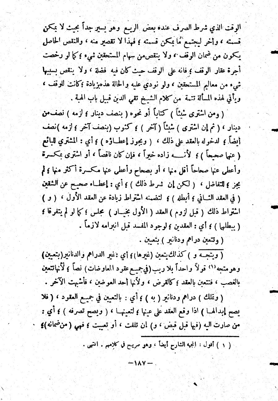 الْوَقْتِ الَّذِي شَرَطَ الصَّرْفَ عِنْدَهُ بَعْضُ الرِّيعِ وَهُوَ يَسِيرٌ جِدًّا بِحَيْثُ لَا يُمْكِنُ قِسْمَتُهُ، وَأُخِّرَ لِيَجْتَمِعَ مَا يُمْكِنُ قِسْمَتُهُ، فَهَذَا لَا تَقْصِيرَ مِنْهُ، وَالنَّقْصُ الْحَاصِلُ يَكُونُ مِنْ ضَمَانِ الْوَقْفِ، وَلَا يَنْقُصُ مِنْ سِهَامِ الْمُسْتَحَقِّينَ شَيْءٌ، كَمَا لَوْ رَخُصَتْ أُجْرَةُ عَقَارِ الْوَقْفِ، فَإِنَّهُ عَلَى الْوَقْفِ حَيْثُ كَانَ فِيهِ فَضْلَةٌ، وَلَا يَنْقُصُ بِسَبَبِهَا شَيْءٌ مِنْ مَعَالِيمِ الْمُسْتَحَقِّينَ، وَلَوْ نُودِيَ عَلَيْهِ وَالْحَالَةُ هَذِهِ بِزِيَادَةٍ، كَانَتْ لِلْوَقْفِ، وَيَأْتِي لِهَذِهِ الْمَسْأَلَةِ تَتِمَّةٌ مِنْ كَلَامِ الشَّيْخِ تَقِيِّ الدِّينِ قُبَيْلَ بَابِ الْهِبَةِ.