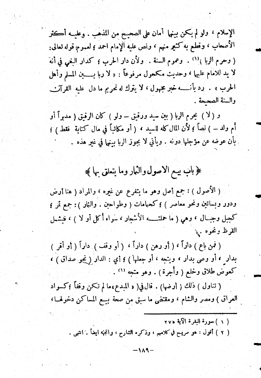 الْإِسْلَامِ، وَلَوْ لَمْ يَكُنْ بَيْنَهُمَا أَمَانٌ عَلَى الصَّحِيحِ مِنْ الْمَذْهَبِ. وَعَلَيْهِ أَكْثَرُ الْأَصْحَابِ، وَقَطَعَ بِهِ كَثِيرٌ مِنْهُمْ، وَنَصَّ الْإِمَامُ أَحْمَدُ، لِعُمُومِ قَوْله تَعَالَى: {وَحَرَّمَ الرِّبَا} [البقرة: 275] ، وَعُمُومِ السُّنَّةِ، وَلِأَنَّ دَارَ الْحَرْبِ، كَدَارِ الْبَغْيِ فِي أَنَّهُ لَا يَدَ لِلْإِمَامِ عَلَيْهِمَا، وَحَدِيثُ مَكْحُولٍ مَرْفُوعًا: «لَا رِبَا بَيْنَ الْمُسْلِمِ وَأَهْلِ الْحَرْبِ» رُدَّ بِأَنَّهُ خَبَرٌ مَجْهُولٌ، لَا يُتْرَكُ لَهُ تَحْرِيمُ مَا دَلَّ عَلَيْهِ الْقُرْآنُ وَالسُّنَّةُ الصَّحِيحَةُ.