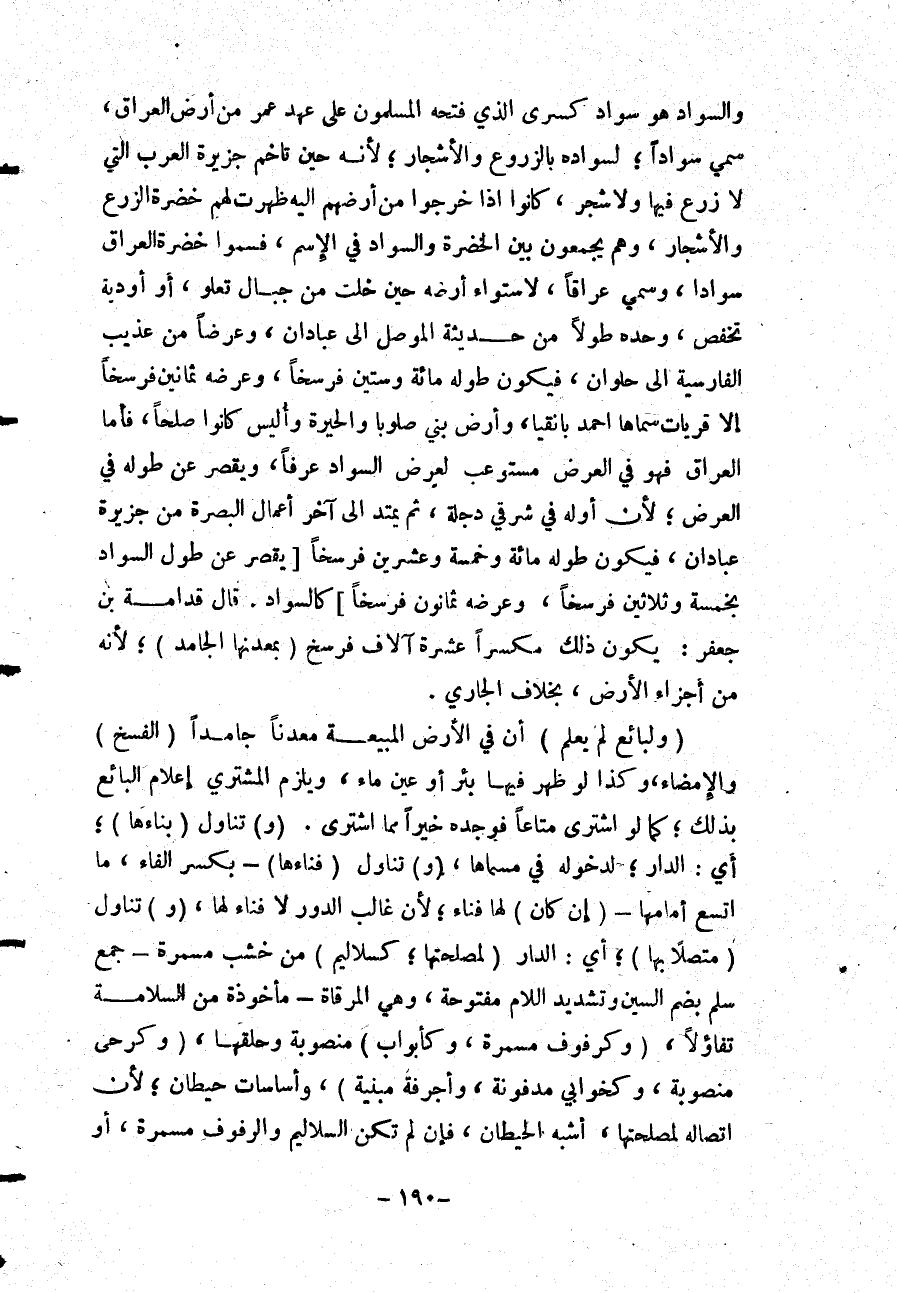 وَالسَّوَادُ هُوَ سَوَادُ كِسْرَى الَّذِي فَتَحَهُ الْمُسْلِمُونَ عَلَى عَهْدِ عُمَرَ مِنْ أَرْضِ الْعِرَاقِ، سُمِّيَ سَوَادًا، لِسَوَادِهِ بِالزُّرُوعِ وَالْأَشْجَارِ؛ لِأَنَّهُ حِينَ تَاخَمَ جَزِيرَةَ الْعَرَبِ الَّتِي لَا زَرْعَ فِيهَا وَلَا شَجَرَ، كَانُوا إذَا خَرَجُوا مِنْ أَرْضِهِمْ إلَيْهِ ظَهَرَتْ لَهُمْ خُضْرَةُ الزَّرْعِ وَالْأَشْجَارِ، وَهُمْ يَجْمَعُونَ بَيْنَ الْخُضْرَةِ وَالسَّوَادِ فِي الِاسْمِ، فَسَمَّوْا خُضْرَةَ الْعِرَاقِ سَوَادًا، وَسُمِّيَ عِرَاقًا، لِاسْتِوَاءِ أَرْضِهِ حِينَ خَلَتْ مِنْ جِبَالٍ تَعْلُو، أَوْ أَوْدِيَةٍ تُخْفَضْ، وَحَدُّهُ طُولًا مِنْ حَدِيثَةِ الْمَوْصِلِ إلَى عَبَّادَانَ، وَعَرْضًا مِنْ عذيب الْفَارِسِيَّةِ إلَى حُلْوَانَ، فَيَكُونُ طُولُهُ مِائَةً وَسِتِّينَ فَرْسَخًا، وَعَرْضُهُ ثَمَانِينَ فَرْسَخًا إلَّا قَرْيَاتٍ سَمَّاهَا أَحْمَدُ بانقيا، وَأَرْضَ بَنِي صلوبا وَالْحِيرَةَ وَأُلَّيْسَ كَانُوا صُلْحًا، فَأَمَّا الْعِرَاقُ فَهُوَ فِي الْعَرْضِ مُسْتَوْعِبٌ لِعَرْضِ السَّوَادِ عُرْفًا، وَيَقْصُرُ عَنْ طُولِهِ فِي الْعَرْضِ؛ لِأَنَّ أَوَّلَهُ فِي شَرْقِيِّ دِجْلَةَ، ثُمَّ يَمْتَدُّ إلَى آخِرِ أَعْمَالِ الْبَصْرَةِ مِنْ جَزِيرَةِ عَبَّادَانَ، فَيَكُونُ طُولُهُ مِائَةً وَخَمْسَةً وَعِشْرِينَ فَرْسَخًا [يَقْصُرُ عَنْ طُولِ السَّوَادِ بِخَمْسَةٍ وَثَلَاثِينَ فَرْسَخًا، وَعَرْضُهُ ثَمَانُونَ فَرْسَخًا] كَالسَّوَادِ. قَالَ قُدَامَةُ بْنُ جَعْفَرٍ: يَكُونُ ذَلِكَ مُكَسَّرًا عَشَرَةَ آلَافِ فَرْسَخٍ (بِمَعْدِنِهَا الْجَامِدِ) ؛ لِأَنَّهُ مِنْ أَجْزَاءِ الْأَرْضِ، بِخِلَافِ الْجَارِي.