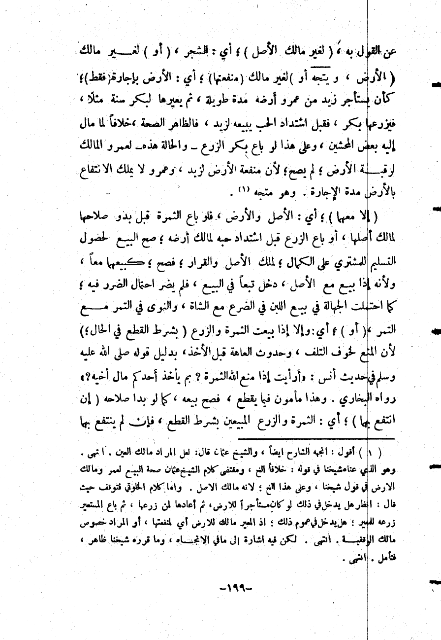 عَنْ الْقَوْلِ بِهِ، (لِغَيْرِ مَالِكِ الْأَصْلِ) ، أَيْ: الشَّجَرِ، (أَوْ) لِغَيْرِ مَالِكِ (الْأَرْضِ، وَيَتَّجِهُ، أَوْ) لِغَيْرِ مَالِكِ (مَنْفَعَتِهَا) ، أَيْ: الْأَرْضِ (بِإِجَارَةٍ فَقَطْ) ، كَأَنْ يَسْتَأْجِرَ زَيْدٌ مِنْ عَمْرٍو أَرْضَهُ مُدَّةً طَوِيلَةً، ثُمَّ يُعِيرَهَا لِبَكْرٍ سَنَةً مَثَلًا، فَيَزْرَعَهَا بَكْرٌ، فَقَبْلَ اشْتِدَادِ الْحَبِّ يَبِيعُهُ لِزَيْدٍ، فَالظَّاهِرُ الصِّحَّةُ، خِلَافًا لِمَا مَالَ إلَيْهِ بَعْضُ الْمُحَشِّينَ، وَعَلَى هَذَا لَوْ بَاعَ بَكْرٌ الزَّرْعَ - وَالْحَالَةُ هَذِهِ - لِعَمْرٍو الْمَالِكِ لِرَقَبَةِ الْأَرْضِ، لَمْ يَصِحَّ؛ لِأَنَّ مَنْفَعَةَ الْأَرْضِ لِزَيْدٍ، وَعَمْرٌو لَا يَمْلِكُ الِانْتِفَاعَ بِالْأَرْضِ مُدَّةَ الْإِجَارَةِ. وَهُوَ مُتَّجِهٌ.