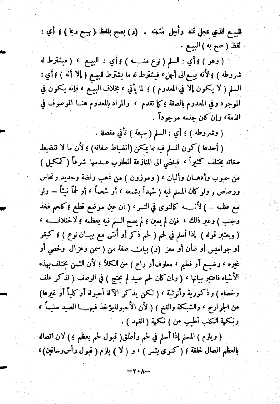 (وَشُرُوطُهُ) ؛ أَيْ: السَّلَمِ (سَبْعَةٌ) تَأْتِي مُفَصَّلَةً (أَحَدُهَا) كَوْنُ الْمُسْلَمِ فِيهِ مِمَّا يُمْكِنُ (انْضِبَاطُ صِفَاتِهِ) ؛ لِأَنَّ مَا لَا تَنْضَبِطُ صِفَاتُهُ يَخْتَلِفُ كَثِيرًا، فَيُفْضِي إلَى الْمُنَازَعَةِ الْمَطْلُوبِ عَدَمُهَا شَرْعًا (كَمَكِيلٍ) مِنْ حُبُوبٍ وَأَدْهَانٍ وَأَلْبَانٍ، (وَمَوْزُونٍ) مِنْ ذَهَبٍ وَفِضَّةٍ وَحَدِيدٍ وَنُحَاسٍ وَرَصَاصٍ وَلَوْ كَانَ الْمُسْلَمُ فِيهِ (شَهِدَا بِشَمْعِهِ، أَوْ شَحْمًا، أَوْ لَحْمًا نِيئًا - وَلَوْ مَعَ عَظْمِهِ -) لِأَنَّهُ كَالنَّوَى فِي التَّمْرِ، (إنْ عُيِّنَ مَوْضِعٌ قُطِعَ؛ كَلَحْمِ فَخِذٍ وَجَنْبٍ) وَغَيْرِ ذَلِكَ، فَإِنْ لَمْ يُعَيَّنْ؛ لَمْ يَصِحَّ السَّلَمُ فِيهِ بِعَظْمِهِ؛ لِاخْتِلَافِهِ، (وَيُعْتَبَرُ قَوْلُهُ) إذَا أَسْلَمَ فِي لَحْمٍ (لَحْمِ ذَكَرٍ أَوْ أُنْثَى مَعَ بَيَانِ نَوْعٍ) ؛ كَبَقَرٍ أَوْ جَوَامِيسَ أَوْ ضَأْنٍ أَوْ مَعْزٍ (وَ) بَيَانِ صِفَةٍ مِنْ (سِمَنٍ وَهُزَالٍ وَخَصْيٍ أَوْ غَيْرِهِ، رَضِيعٍ أَوْ فَطِيمٍ، مَعْلُوفٍ أَوْ رَاعٍ) مِنْ الْكَلَأِ؛ لِأَنَّ الثَّمَنَ يَخْتَلِفُ بِهَذِهِ الْأَشْيَاءِ، فَاعْتُبِرَ بَيَانُهَا، (وَإِنْ كَانَ لَحْمَ صَيْدٍ لَمْ يَحْتَجْ) فِي الْوَصْفِ (لِذِكْرِ عَلَفٍ وَخِصَاءٍ) وَذُكُورِيَّةٍ وَأُنُوثِيَّةٍ، (لَكِنْ يَذْكُرُ الْآلَةَ أُحْبُولَةً أَوْ كَلْبًا أَوْ غَيْرَهَا) مِنْ الْجَوَارِحِ، وَالشَّبَكَةَ وَالْفَخَّ؛ (لِأَنَّ الْأُحْبُولَةَ يُؤْخَذُ فِيهَا الصَّيْدُ سَلِيمًا، وَنَكْهَةُ الْكَلْبِ أَطْيَبُ مِنْ) نَكْهَةِ (الْفَهْدِ) .