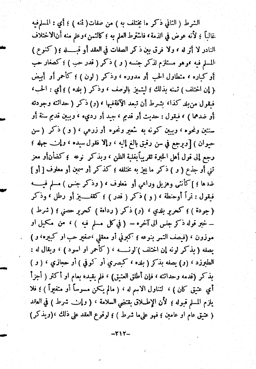 الشَّرْطُ (الثَّانِي ذِكْرُ مَا يَخْتَلِفُ بِهِ) مِنْ صِفَاتٍ (ثَمَنُهُ) ؛ أَيْ: الْمُسْلَمِ فِيهِ غَالِبًا؛ لِأَنَّهُ عِوَضٌ فِي الذِّمَّةِ، فَاشْتُرِطَ الْعِلْمُ بِهِ؛ كَالثَّمَنِ، وَعُلِمَ مِنْهُ أَنَّ الِاخْتِلَافَ النَّادِرَ لَا أَثَرَ لَهُ، وَلَا فَرْقَ بَيْنَ ذِكْرِ الصِّفَاتِ فِي الْعَقْدِ أَوْ قَبْلَهُ؛ (كَنَوْعِ) الْمُسْلَمِ فِيهِ، وَهُوَ مُسْتَلْزِمٌ لِذِكْرِ جِنْسِهِ، (وَ) ذِكْرِ (قَدْرِ حَبٍّ) ؛ كَصِغَارِ حَبٍّ أَوْ كِبَارِهِ، مُتَطَاوِلِ الْحَبِّ أَوْ مُدَوَّرِهِ، وَذِكْرِ (لَوْنٍ) ؛ كَأَحْمَرَ أَوْ أَبْيَضَ (إنْ اخْتَلَفَ) ثَمَنُهُ بِذَلِكَ؛ لِيَتَمَيَّزَ بِالْوَصْفِ، وَذِكْرِ (بَلَدِهِ) ؛ أَيْ: الْحَبِّ، فَيَقُولُ مِنْ بَلَدِ كَذَا؛ بِشَرْطِ أَنْ تَبْعُدَ الْآفَةُ فِيهَا، (وَ) ذِكْرِ (حَدَاثَتِهِ وُجُودَتِهِ أَوْ ضِدِّهِمَا) ، فَيَقُولُ: حَدِيثٌ أَوْ قَدِيمٌ، جَيِّدٌ أَوْ رَدِيءٌ، وَيُبَيِّنُ قَدِيمَ سَنَةٍ أَوْ سَنَتَيْنِ وَنَحْوَهُ، وَيُبَيِّنُ كَوْنَهُ بِهِ شَعِيرٌ وَنَحْوُهُ أَوْ زَرْعِيٌّ، (وَ) ذِكْرِ (سِنِّ حَيَوَانٍ) وَيُرْجَعُ فِي سِنِّ رَقِيقٍ بَالِغٍ إلَيْهِ، وَإِلَّا فَقَوْلُ سَيِّدِهِ، وَإِنْ جَهِلَهُ؛ رُجِعَ إلَى قَوْلِ أَهْلِ الْخِبْرَةِ تَقْرِيبًا بِغَلَبَةِ الظَّنِّ، وَبِذِكْرِ نَوْعِهِ؛ كَضَأْنٍ أَوْ مَعْزٍ ثَنِيٍّ أَوْ جَذَعٍ (وَ) ذِكْرِ مَا يُمَيَّزُ بِهِ مُخْتَلِفُهُ؛ كَذَكَرٍ أَوْ سَمِينٍ أَوْ مَعْلُوفٍ [أَوْ] ضِدِّهَا؛ [كَأُنْثَى وَهَزِيلٍ وَرَاعٍ أَوْ مَعْلُوفٍ] ، (وَذِكْرِ جِنْسٍ) مُسْلَمٍ فِيهِ فَيَقُولُ: تَمْرًا أَوْ حِنْطَةً، (وَ) ذِكْرِ (قَدْرٍ) ؛ كَقَفِيزٍ أَوْ رِطْلٍ، وَذِكْرِ (جُودَةٍ) ؛ كَحَرِيرٍ بَلَدِيٍّ، (وَ) ذِكْرِ (رَدَاءَةٍ) كَحَرِيرٍ حِصْنِيٍّ؛ (شَرْطٌ) - خَبَرُ قَوْلِهِ ذِكْرُ جِنْسٍ إلَى آخِرِهِ - (فِي كُلِّ مُسْلَمٍ فِيهِ) ، مِنْ مَكِيلٍ أَوْ مَوْزُونٍ، (فَيَصِفُ التَّمْرَ بِنَوْعِهِ؛ كَبَرْنِيِّ أَوْ مَعْقِلِيٍّ، صَغِيرِ حَبٍّ أَوْ كَبِيرِهِ، وَ) يَصِفُهُ (بِذِكْرِ لَوْنِهِ إنْ اخْتَلَفَ) لَوْنُهُ، (كَأَحْمَرَ أَوْ أَسْوَدَ) ، وَيُقَالُ لَهُ: الطبرزد، (وَ) يَصِفُهُ بِذِكْرِ (بَلَدِهِ، كَبَصْرِيٍّ أَوْ كُوفِيٍّ) أَوْ حِجَازِيٍّ، (وَ) بِذِكْرِ (قِدَمِهِ وَحَدَاثَتِهِ، فَإِنْ أَطْلَقَ الْعَتِيقَ) ، فَلَمْ يُقَيِّدْهُ بِعَامٍ أَوْ أَكْثَرَ (أَجْزَأَ، أَيَّ عَتِيقٍ كَانَ) ، لِتَنَاوُلِ الِاسْمِ لَهُ، (مَا لَمْ يَكُنْ مُسَوَّسًا أَوْ مُتَغَيِّرًا) ؛ فَلَا يَلْزَمُ الْمُسْلِمَ قَبُولُهُ؛ لِأَنَّ الْإِطْلَاقَ يَقْتَضِي السَّلَامَةَ، (وَإِنْ شُرِطَ) فِي الْعَقْدِ (عَتِيقُ عَامٍ أَوْ عَامَيْنِ؛ فَهُوَ عَلَى مَا شُرِطَ) ؛ لِوُقُوعِ الْعَقْدِ عَلَى ذَلِكَ، (وَيُذْكَرُ)
