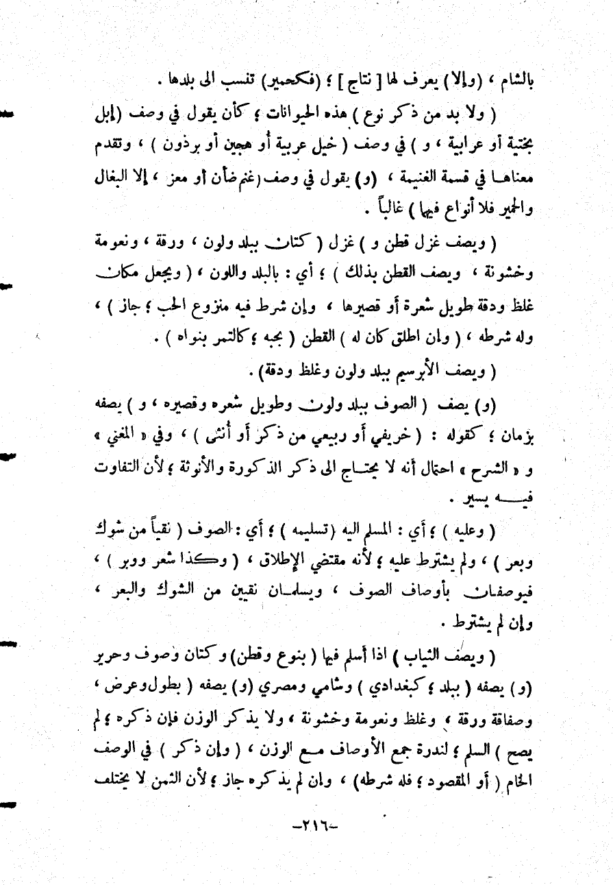 بِالشَّامِ، (وَإِلَّا) يُعْرَفْ لَهَا [نِتَاجٌ] ؛ (فَكَحَمِيرٍ) تُنْسَبُ إلَى بَلَدِهَا. (وَلَا بُدَّ مِنْ ذِكْرِ نَوْعِ) هَذِهِ الْحَيَوَانَاتِ؛ كَأَنْ يَقُولَ فِي وَصْفِ (إبِلٍ بُخْتِيَّةٍ أَوْ عَرَابِيَّةٍ، وَ) فِي وَصْفِ (خَيْلٍ عَرَبِيَّةٍ أَوْ هَجِينٍ أَوْ بِرْذَوْنٍ) ، وَتَقَدَّمَ مَعْنَاهَا فِي قِسْمَةِ الْغَنِيمَةِ، (وَ) : يَقُولُ فِي وَصْفِ (غَنَمٍ ضَأْنٍ أَوْ مَعْزٍ، إلَّا الْبِغَالَ وَالْحَمِيرَ فَلَا أَنْوَاعَ فِيهِمَا) غَالِبًا. (وَيَصِفُ غَزْلَ قُطْنٍ وَ) غَزْلَ (كَتَّانٍ بِبَلَدٍ وَلَوْنٍ، وَرِقَّةٍ، وَنُعُومَةٍ وَخُشُونَةٍ، وَيَصِفُ الْقُطْنَ بِذَلِكَ) ؛ أَيْ: بِالْبَلَدِ وَاللَّوْنِ، (وَيَجْعَلُ مَكَانَ غِلَظٍ وَدِقَّةٍ طَوِيلَ شَعْرَةٍ أَوْ قَصِيرَهَا، وَإِنْ شَرَطَ فِيهِ مَنْزُوعَ الْحَبِّ؛ جَازَ) ، وَلَهُ شَرْطُهُ، (وَإِنْ أَطْلَقَ كَانَ لَهُ) الْقُطْنُ (بِحَبِّهِ؛ كَالتَّمْرِ بِنَوَاهُ) . (وَيَصِفُ الْإِبْرَيْسَمَ بِبَلَدٍ وَلَوْنٍ وَغِلَظٍ وَدِقَّةٍ) . (وَ) يَصِفُ (الصُّوفَ بِبَلَدٍ وَلَوْنٍ وَطَوِيلِ شَعْرِهِ وَقَصِيرِهِ، وَ) يَصِفُهُ بِزَمَانٍ؛ كَقَوْلِهِ: (خَرِيفِيٌّ أَوْ رَبِيعِيٌّ مِنْ ذَكَرٍ أَوْ أُنْثَى) ، وَفِي " الْمُغْنِي " " وَالشَّرْحِ " احْتِمَالُ أَنَّهُ لَا يُحْتَاجُ إلَى ذِكْرِ الذُّكُورَةِ وَالْأُنُوثَةِ؛ لِأَنَّ التَّفَاوُتَ فِيهِ يَسِيرٌ. (وَعَلَيْهِ) ؛ أَيْ: الْمُسْلَمِ إلَيْهِ (تَسْلِيمُهُ) ؛ أَيْ: الصُّوفِ (نَقِيًّا مِنْ شَوْكٍ وَبَعْرٍ) ، وَلَمْ يُشْتَرَطْ عَلَيْهِ؛ لِأَنَّهُ مُقْتَضَى الْإِطْلَاقِ، (وَكَذَا شَعْرٌ وَوَبَرٌ) ، فَيُوصَفَانِ بِأَوْصَافِ الصُّوفِ، وَيُسْلَمَانِ نَقِيَّيْنِ مِنْ الشَّوْكِ وَالْبَعْرِ، وَإِنْ لَمْ يُشْتَرَطْ. (وَيَصِفُ الثِّيَابَ) إذَا أَسْلَمَ فِيهَا (بِنَوْعٍ وَقُطْنٍ) وَكَتَّانٍ وَصُوفٍ وَحَرِيرٍ (وَ) يَصِفُهُ (بِبَلَدٍ؛ كَبَغْدَادِيٍّ) وَشَامِيٍّ وَمِصْرِيٍّ (وَ) يَصِفُهُ (بِطُولٍ وَعَرْضٍ، وَصَفَاقَةٍ وَرِقَّةٍ، وَغِلَظٍ وَنُعُومَةٍ وَخُشُونَةٍ، وَلَا يَذْكُرُ الْوَزْنَ فَإِنْ ذَكَرَهُ؛ لَمْ يَصِحَّ) السَّلَمُ؛ لِنُدْرَةِ جَمْعِ الْأَوْصَافِ مَعَ الْوَزْنِ، (وَإِنْ ذَكَرَ) فِي الْوَصْفِ الْخَامَ (أَوْ الْمَقْصُودَ؛ فَلَهُ شَرْطُهُ) ، وَإِنْ لَمْ يَذْكُرْهُ جَازَ؛ لِأَنَّ الثَّمَنَ لَا يَخْتَلِفُ