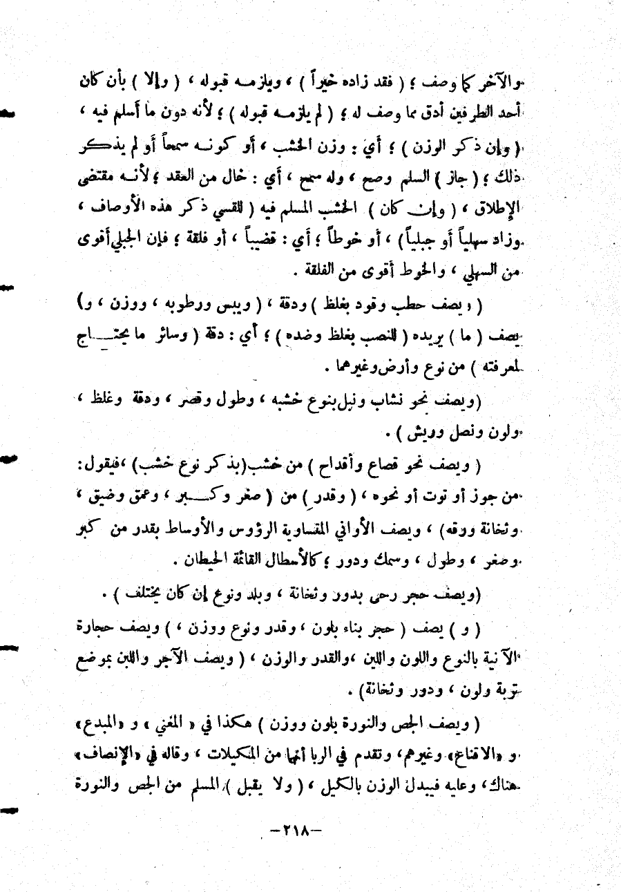 وَالْآخَرُ كَمَا وَصَفَ؛ (فَقَدْ زَادَهُ خَيْرًا) ، وَيَلْزَمُهُ قَبُولُهُ، (وَإِلَّا) ؛ بِأَنْ كَانَ أَحَدُ الطَّرَفَيْنِ أَدَقَّ مِمَّا وَصَفَ لَهُ؛ (لَمْ يَلْزَمْهُ قَبُولُهُ) ؛ لِأَنَّهُ دُونَ مَا أَسْلَمَ فِيهِ، (وَإِنْ ذَكَرَ الْوَزْنَ) ؛ أَيْ: وَزْنَ الْخَشَبِ، أَوْ كَوْنَهُ سَمْحًا أَوْ لَمْ يَذْكُرْ ذَلِكَ؛ (جَازَ) السَّلَمُ وَصَحَّ، وَلَهُ سَمْحٌ، أَيْ: خَالٍ مِنْ الْعُقَدِ؛ لِأَنَّهُ؛ مُقْتَضَى الْإِطْلَاقِ، (وَإِنْ كَانَ) الْخَشَبُ الْمُسْلَمُ فِيهِ (لِلْقِسِيِّ ذَكَرَ هَذِهِ الْأَوْصَافَ، وَزَادَ سَهْلِيًّا أَوْ جَبَلِيًّا) ، أَوْ خُوطًا؛ أَيْ: قَضِيبًا، أَوْ فَلَقَةً؛ فَإِنَّ الْجَبَلِيَّ أَقْوَى مِنْ السَّهْلِيِّ، وَالْخُوطَ أَقْوَى مِنْ الْفَلَقَةِ (وَيَصِفُ حَطَبَ وُقُودٍ بِغِلَظٍ) وَدِقَّةٍ، (وَيُبْسٍ وَرُطُوبَةٍ، وَوَزْنٍ، وَ) يَصِفُ (مَا) يُرِيدُهُ (لِلنَّصَبِ بِغِلَظٍ وَضِدِّهِ) ؛ أَيْ: دِقَّةٍ (وَسَائِرَ مَا يُحْتَاجُ لِمَعْرِفَتِهِ) مِنْ نَوْعٍ وَأَرْضٍ وَغَيْرِهِمَا. (وَيَصِفُ نَحْوَ نُشَّابٍ وَنَبْلٍ بِنَوْعِ خَشَبِهِ، وَطُولٍ وَقِصَرٍ، وَدِقَّةٍ وَغِلَظٍ، وَلَوْنٍ وَنَصْلٍ وَرِيشٍ) . (وَيَصِفُ نَحْوَ قِصَاعٍ وَأَقْدَاحٍ) مِنْ خَشَبٍ (بِذِكْرِ نَوْعِ خَشَبٍ) ، فَيَقُولُ: مِنْ جَوْزٍ أَوْ تُوتٍ أَوْ نَحْوِهِ، (وَقَدْرٍ) مِنْ (صِغَرٍ وَكِبَرٍ، وَعُمْقٍ وَضِيقٍ، وَثَخَانَةٍ وَرِقَّةٍ) ، وَيَصِفُ الْأَوَانِيَ الْمُتَسَاوِيَةَ الرُّءُوسِ وَالْأَوْسَاطِ بِقَدْرٍ مِنْ كِبَرٍ وَصِغَرٍ، وَطُولٍ، وَسُمْكٍ وَدَوْرٍ؛ كَالْأَسْطَالِ الْقَائِمَةِ الْحِيطَانِ.