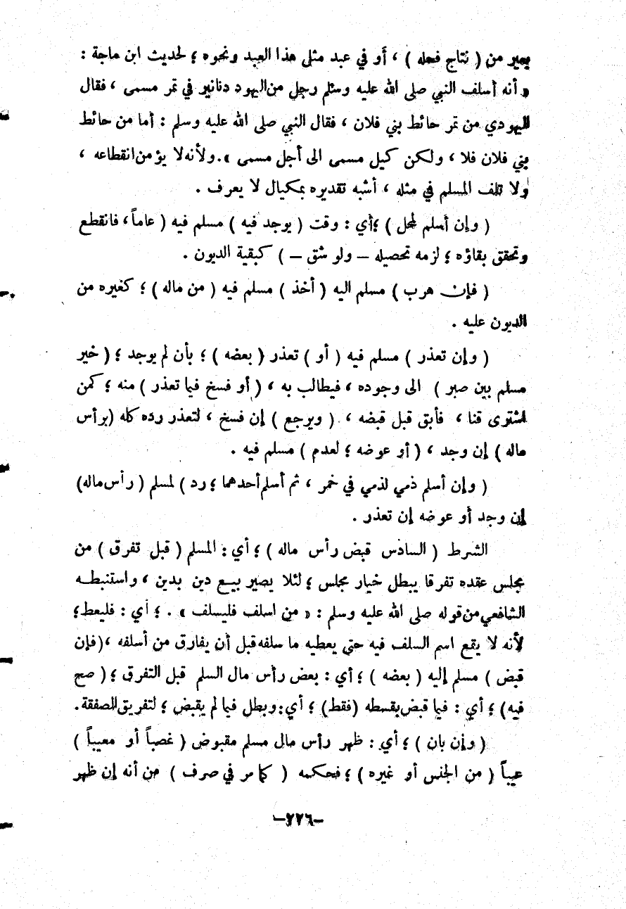 بَعِيرٍ مِنْ (نِتَاجِ فَحْلِهِ) ، أَوْ فِي عَبْدٍ مِثْلِ هَذَا الْعَبْدِ وَنَحْوِهِ؛ لِحَدِيثِ ابْنِ مَاجَهْ: «أَنَّهُ أَسْلَفَ النَّبِيَّ - صَلَّى اللَّهُ عَلَيْهِ وَسَلَّمَ - رَجُلٌ مِنْ الْيَهُودِ دَنَانِيرَ فِي تَمْرٍ مُسَمًّى، فَقَالَ الْيَهُودِيُّ مِنْ تَمْرِ حَائِطِ بَنِي فُلَانٍ، فَقَالَ - صَلَّى اللَّهُ عَلَيْهِ وَسَلَّمَ -: أَمَّا مِنْ حَائِطِ بَنِي فُلَانٍ فَلَا، وَلَكِنْ كَيْلٌ مُسَمًّى إلَى أَجَلٍ مُسَمًّى» وَلِأَنَّهُ لَا يُؤْمَنُ انْقِطَاعُهُ، وَلَا تَلَفُ الْمُسْلَمِ فِي مِثْلِهِ، أَشْبَهَ تَقْدِيرَهُ بِمِكْيَالٍ لَا يُعْرَفُ. (وَإِنْ أَسْلَمَ لِمَحِلٍّ) ؛ أَيْ: وَقْتٍ (يُوجَدُ فِيهِ) مُسْلَمٌ فِيهِ (عَامًا، فَانْقَطَعَ وَتَحَقَّقَ بَقَاؤُهُ؛ لَزِمَهُ تَحْصِيلُهُ - وَلَوْ شَقَّ -) كَبَقِيَّةِ الدُّيُونِ. (فَإِنْ هَرَبَ) مُسْلَمٌ إلَيْهِ (أُخِذَ) مُسْلَمٌ فِيهِ (مِنْ مَالِهِ) ؛ كَغَيْرِهِ مِنْ الدُّيُونِ عَلَيْهِ. (وَإِنْ تَعَذَّرَ) مُسْلَمٌ فِيهِ (أَوْ) تَعَذَّرَ (بَعْضُهُ) ؛ بِأَنْ لَمْ يُوجَدْ؛ (خُيِّرَ مُسْلِمٌ بَيْنَ صَبْرٍ) إلَى وُجُودِهِ، فَيُطَالِبُ بِهِ، (أَوْ فَسْخٍ فِيمَا تَعَذَّرَ) مِنْهُ؛ كَمَنْ اشْتَرَى قِنًّا، فَأَبَقَ قَبْلَ قَبْضِهِ، (وَيَرْجِعُ) إنْ فَسَخَ، لِتَعَذُّرِ رَدِّهِ كُلِّهِ (بِرَأْسِ مَالِهِ) إنْ وُجِدَ، (أَوْ عِوَضِهِ؛ لِعَدَمِ) مُسْلَمٍ فِيهِ. (وَإِنْ أَسْلَمَ ذِمِّيٌّ لِذِمِّيٍّ فِي خَمْرٍ، ثُمَّ أَسْلَمَ أَحَدُهُمَا؛ رَدَّ) لِمُسْلِمٍ (رَأْسَ مَالِهِ) إنْ وُجِدَ أَوْ عِوَضَهُ إنْ تَعَذَّرَ.