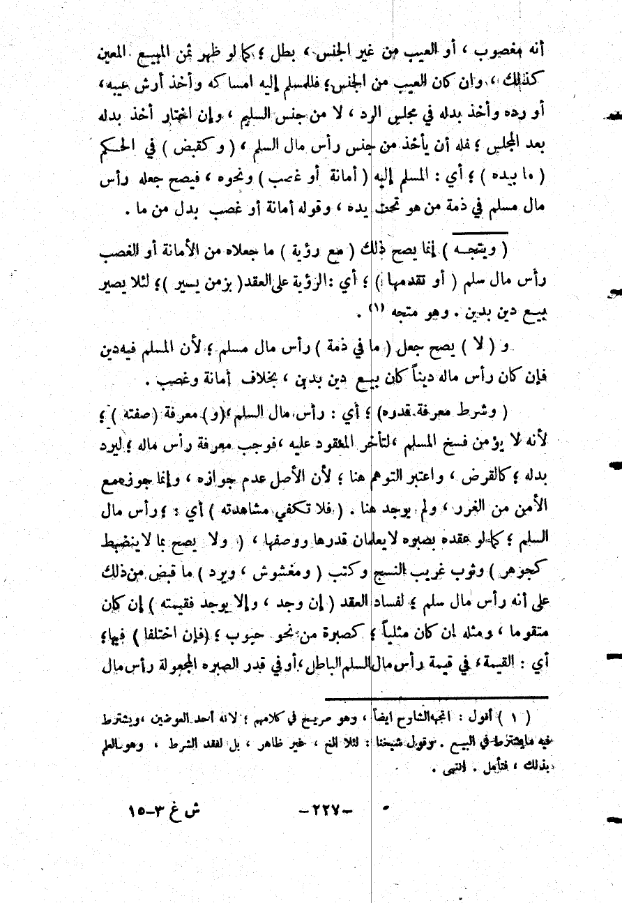 أَنَّهُ مَغْصُوبٌ، أَوْ الْعَيْبُ مِنْ غَيْرِ الْجِنْسِ، بَطَلَ؛ كَمَا لَوْ ظَهَرَ ثَمَنُ الْمَبِيعِ الْمُعَيَّنِ كَذَلِكَ، وَإِنْ كَانَ الْعَيْبُ مِنْ الْجِنْسِ؛ فَلِلْمُسْلَمِ إلَيْهِ إمْسَاكُهُ وَأَخْذُ أَرْشِ عَيْبِهِ، أَوْ رَدُّهُ وَأَخْذُ بَدَلِهِ فِي مَجْلِسِ الرَّدِّ، لَا مِنْ جِنْسِ السَّلِيمِ، وَإِنْ اخْتَارَ أَخْذُ بَدَلِهِ بَعْدَ الْمَجْلِسِ؛ فَلَهُ أَنْ يَأْخُذَ مِنْ جِنْسِ رَأْسِ مَالِ السَّلَمِ، (وَكَقَبْضٍ) فِي الْحُكْمِ (مَا بِيَدِهِ) ؛ أَيْ: الْمُسْلَمِ إلَيْهِ (أَمَانَةٌ أَوْ غَصْبٌ) وَنَحْوُهُ، فَيَصِحُّ جَعْلُهُ رَأْسَ مَالٍ مُسْلِمٍ فِي ذِمَّةِ مَنْ هُوَ تَحْتَ يَدِهِ، وَقَوْلُهُ أَمَانَةٌ أَوْ غَصْبٌ بَدَلٌ مِنْ مَا. (وَيَتَّجِهُ) إنَّمَا يَصِحُّ ذَلِكَ (مَعَ رُؤْيَةِ) مَا جَعَلَاهُ مِنْ الْأَمَانَةِ أَوْ الْغَصْبِ رَأْسَ مَالِ سَلَمٍ (أَوْ تَقَدُّمُهَا) ؛ أَيْ: الرُّؤْيَةِ عَلَى الْعَقْدِ (بِزَمَنٍ يَسِيرٍ) ؛ لِئَلَّا يَصِيرَ بَيْعَ دَيْنٍ بِدَيْنٍ. وَهُوَ مُتَّجِهٌ (لَا) يَصِحُّ جَعْلُ (مَا فِي ذِمَّةٍ) رَأْسَ مَالِ مُسْلِمٍ؛ لِأَنَّ الْمُسْلَمَ فِيهِ دَيْنٌ فَإِنْ كَانَ رَأْسُ مَالِهِ دَيْنًا كَانَ بَيْعَ دَيْنٍ بِدَيْنٍ، بِخِلَافِ أَمَانَةٍ وَغَصْبٍ. (وَشَرْطِ مَعْرِفَةِ قَدْرِهِ) ؛ أَيْ: رَأْسِ مَالِ السَّلَمِ، (وَ) مَعْرِفَةِ (صِفَتِهِ) ؛ لِأَنَّهُ لَا يُؤْمَنُ فَسْخُ الْمُسْلِمِ، لِتَأَخُّرِ الْمَعْقُودِ عَلَيْهِ، فَوَجَبَ مَعْرِفَةُ رَأْسِ مَالِهِ؛ لِيُرَدَّ بَدَلُهُ؛ كَالْقَرْضِ، وَاعْتُبِرَ التَّوَهُّمُ هُنَا؛ لِأَنَّ الْأَصْلَ عَدَمُ جَوَازِهِ، وَإِنَّمَا جَوَّزَهُ مَعَ الْأَمْنِ مِنْ الْغَرَرِ، وَلَمْ يُوجَدْ هُنَا. (فَلَا تَكْفِي مُشَاهَدَتُهُ) أَيْ: رَأْسِ مَالِ السَّلَمِ؛ كَمَا لَوْ عَقَدَهُ بِصُبْرَةٍ لَا يَعْلَمَانِ قَدْرَهَا وَوَصْفَهَا، (وَلَا يَصِحُّ بِمَا لَا يَنْضَبِطُ كَجَوْهَرٍ) وَثَوْبٍ غَرِيبِ النَّسْجِ وَكُتُبٍ (وَمَغْشُوشٍ، وَيَرُدُّ) مَا قَبَضَ مِنْ ذَلِكَ عَلَى أَنَّهُ رَأْسُ مَالِ سَلَمٍ؛ لِفَسَادِ الْعَقْدِ (إنْ وُجِدَ، وَإِلَّا يُوجَدْ فَقِيمَتُهُ) إنْ كَانَ مُتَقَوِّمًا، وَمِثْلُهُ إنْ كَانَ مِثْلِيًّا؛ كَصُبْرَةٍ مِنْ نَحْوِ حُبُوبٍ؛ (فَإِنْ اخْتَلَفَا) فِيهَا؛ أَيْ: الْقِيمَةِ، فِي قِيمَةِ رَأْسِ مَالِ السَّلَمِ الْبَاطِلِ، أَوْ فِي قَدْرِ الصُّبْرَةِ الْمَجْعُولَةِ رَأْسَ مَالِ