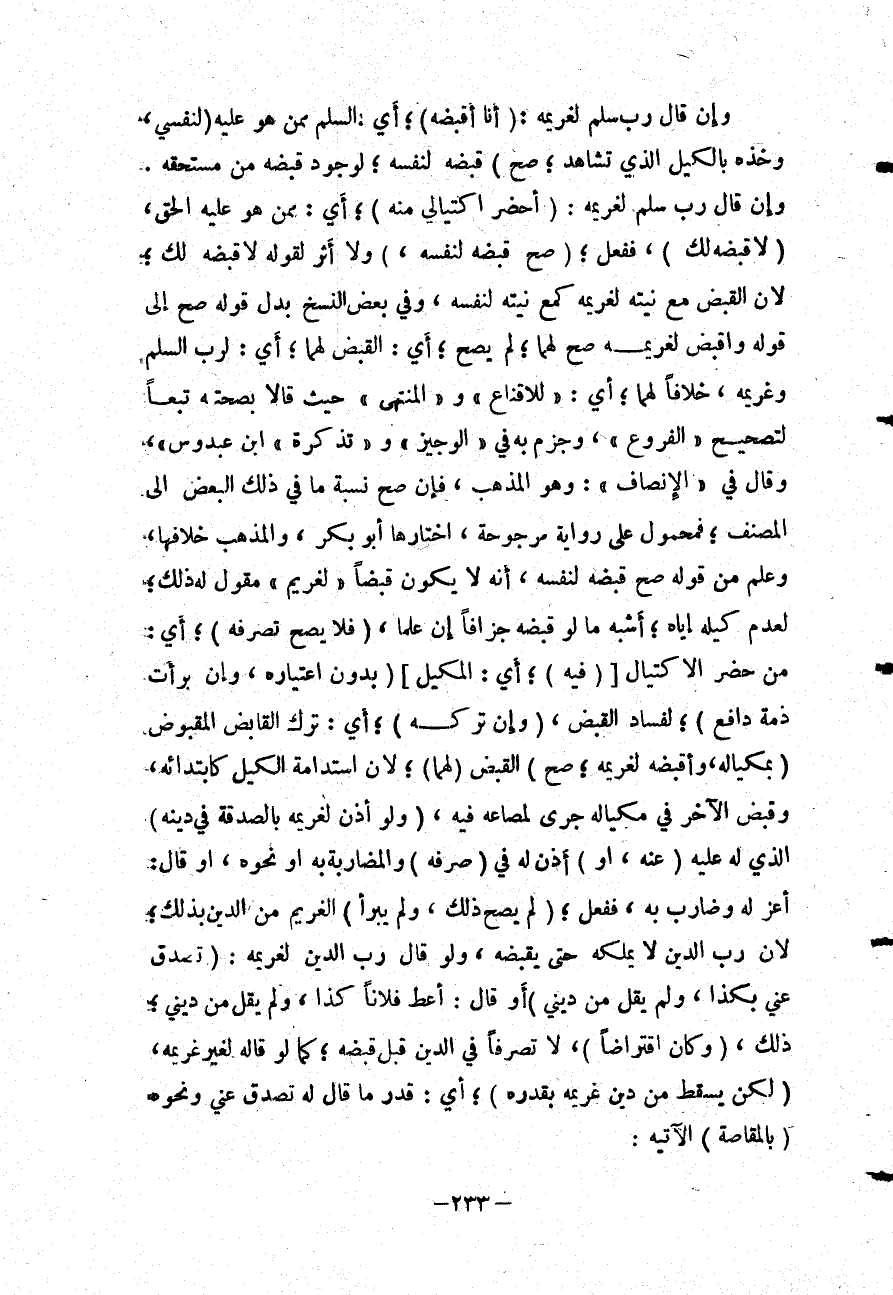 وَإِنْ قَالَ رَبُّ سَلَمٍ لِغَرِيمِهِ: (أَنَا أَقْبِضُهُ) ؛ أَيْ: السَّلَمَ مِمَّنْ هُوَ عَلَيْهِ (لِنَفْسِي، وَخُذْهُ بِالْكَيْلِ الَّذِي تُشَاهِدُ؛ صَحَّ) قَبْضُهُ لِنَفْسِهِ؛ لِوُجُودِ قَبْضِهِ مِنْ مُسْتَحِقِّهِ. وَإِنْ قَالَ رَبُّ سَلَمٍ لِغَرِيمِهِ: (أَحْضِرْ اكْتِيَالِي مِنْهُ) ؛ أَيْ: مِمَّنْ هُوَ عَلَيْهِ الْحَقُّ، (لِأَقْبِضَهُ لَك) ، فَفَعَلَ (صَحَّ قَبْضُهُ لِنَفْسِهِ،) وَلَا أَثَرَ لِقَوْلِهِ لِأَقْبِضَهُ لَكَ؛ لِأَنَّ الْقَبْضَ مَعَ نِيَّتِهِ لِغَرِيمِهِ كَمَعَ نِيَّتِهِ لِنَفْسِهِ، وَفِي بَعْضِ النُّسَخِ بُدِّلَ قَوْلُهُ صَحَّ إلَى قَوْلِهِ وَاقْبِضْ لِغَرِيمِهِ صَحَّ لَهُمَا؛ لَمْ يَصِحَّ؛ أَيْ: الْقَبْضُ لَهُمَا؛ أَيْ: لِرَبِّ السَّلَمِ. وَغَرِيمِهِ، خِلَافًا لَهُمَا؛ أَيْ: " لِلْإِقْنَاعِ " وَالْمُنْتَهَى " حَيْثُ قَالَا بِصِحَّتِهِ تَبَعًا لِتَصْحِيحِ " الْفُرُوعِ "، وَجَزَمَ بِهِ فِي " الْوَجِيزِ " وَتَذْكِرَةِ " ابْنِ عَبْدُوسٍ "، وَقَالَ فِي " الْإِنْصَافِ ": وَهُوَ الْمَذْهَبُ، فَإِنْ صَحَّ نِسْبَةُ مَا فِي ذَلِكَ الْبَعْضِ إلَى الْمُصَنِّفِ؛ فَمَحْمُولٌ عَلَى رِوَايَةِ مَرْجُوحَةٍ، اخْتَارَهَا أَبُو بَكْرٍ، وَالْمَذْهَبُ خِلَافُهَا، وَعُلِمَ مِنْ قَوْلِهِ صَحَّ قَبْضُهُ لِنَفْسِهِ، أَنَّهُ لَا يَكُونُ قَبْضًا " لِغَرِيمٍ " مَقُولٍ لَهُ ذَلِكَ؛ لِعَدَمِ كَيْلِهِ إيَّاهُ؛ أَشْبَهَ مَا لَوْ قَبَضَهُ جُزَافًا إنْ عَلِمَا، (فَلَا يَصِحُّ تَصَرُّفُهُ) ؛ أَيْ: مَنْ حَضَرَ الِاكْتِيَالَ [ (فِيهِ) ؛ أَيْ: الْمَكِيلِ] (بِدُونِ اعْتِبَارِهِ، وَإِنْ بَرَأَتْ ذِمَّةُ دَافِعٍ) ؛ لِفَسَادِ الْقَبْضِ، (وَإِنْ تَرَكَهُ) ؛ أَيْ: تَرَكَ الْقَابِضُ الْمَقْبُوضَ (بِمِكْيَالِهِ، وَأَقْبَضَهُ لِغَرِيمِهِ؛ صَحَّ) الْقَبْضُ (لَهُمَا) ؛ لِأَنَّ اسْتِدَامَةَ الْكَيْلِ كَابْتِدَائِهِ، وَقَبْضُ الْآخَرِ فِي مِكْيَالِهِ جَرَى لِمُصَاعِهِ فِيهِ، (وَلَوْ أَذِنَ لِغَرِيمِهِ بِالصَّدَقَةِ فِي دَيْنِهِ) الَّذِي لَهُ عَلَيْهِ (عَنْهُ، أَوْ) أَذِنَ لَهُ فِي (صَرْفِهِ) وَالْمُضَارَبَةِ أَوْ نَحْوِهِ، أَوْ قَالَ: اعْزِلْهُ وَضَارِبْ بِهِ، فَفَعَلَ؛ (لَمْ يَصِحَّ ذَلِكَ، وَلَمْ يَبْرَأْ) الْغَرِيمُ مِنْ الدَّيْنِ بِذَلِكَ؛ لِأَنَّ رَبَّ الدَّيْنِ لَا يَمْلِكُهُ حَتَّى يَقْبِضَهُ، وَلَوْ قَالَ رَبُّ الدَّيْنَ لِغَرِيمِهِ: (تَصَدَّقْ عَنِّي بِكَذَا، وَلَمْ يَقُلْ مِنْ دَيْنِي) أَوْ قَالَ: أَعْطِ فُلَانًا كَذَا، وَلَمْ يَقُلْ مِنْ دَيْنِي؛ ذَلِكَ، (وَكَانَ اقْتِرَاضًا) ، لَا تَصَرُّفًا فِي الدَّيْنِ قَبْلَ قَبْضِهِ؛ كَمَا لَوْ قَالَهُ لِغَيْرِ غَرِيمِهِ، (لَكِنْ يَسْقُطُ مِنْ دَيْنِ غَرِيمِهِ بِقَدْرِهِ) ؛ أَيْ: قَدْرِ مَا قَالَ لَهُ تَصَدَّقْ عَنِّي وَنَحْوِهِ. (بِالْمُقَاصَّةِ) الْآتِيَةِ: