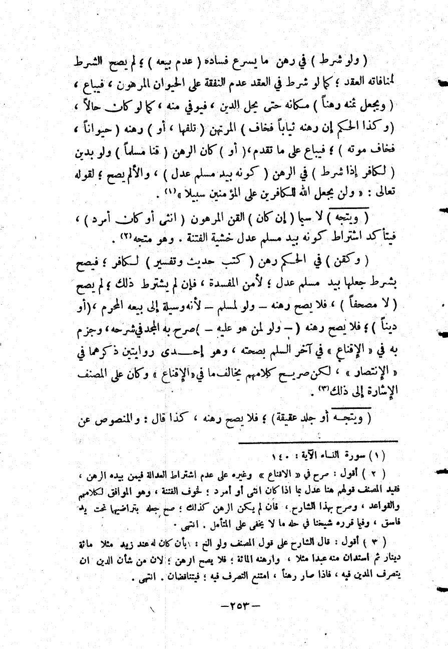 (وَكَقِنٍّ) فِي الْحُكْمِ رَهْنُ (كُتُبِ حَدِيثٍ وَتَفْسِيرٍ) لِكَافِرِ؛ فَيَصِحُّ بِشَرْطِ جَعْلِهَا بِيَدِ مُسْلِمٍ عَدْلٍ؛ لِأَمْنِ الْمَفْسَدَةِ، فَإِنْ لَمْ يُشْتَرَطْ ذَلِكَ؛ لَمْ يَصِحَّ (لَا مُصْحَفًا) ، فَلَا يَصِحُّ رَهْنُهُ - وَلَوْ لِمُسْلِمٍ - لِأَنَّهُ وَسِيلَةٌ إلَى بَيْعِهِ الْمُحَرَّمِ، (أَوْ دَيْنًا) ؛ فَلَا يَصِحُّ رَهْنُهُ (- وَلَوْ لِمَنْ هُوَ عَلَيْهِ -) صَرَّحَ بِهِ الْمَجْدُ فِي شَرْحِهِ، وَجَزَمَ بِهِ فِي " الْإِقْنَاعِ " فِي آخِرِ السَّلَمِ بِصِحَّتِهِ، وَهُوَ إحْدَى رِوَايَتَيْنِ ذَكَرَهُمَا فِي " الِانْتِصَارِ " لَكِنَّ صَرِيحَ كَلَامِهِمْ يُخَالِفُ مَا فِي " الْإِقْنَاعِ " وَكَانَ عَلَى الْمُصَنِّفِ الْإِشَارَةُ إلَى ذَلِكَ.
