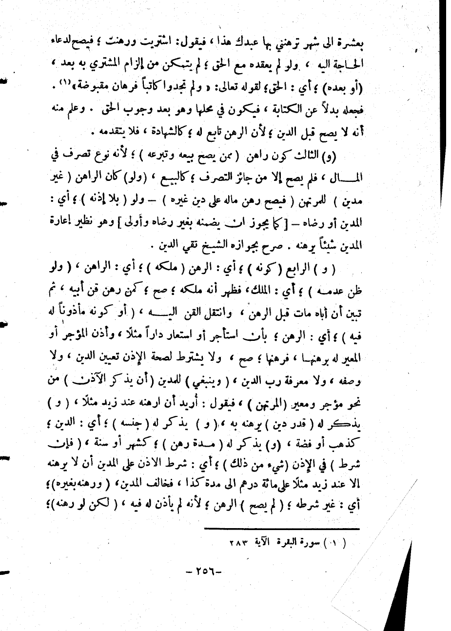 بِعَشَرَةٍ إلَى شَهْرٍ تَرْهَنُنِي بِهَا عَبْدَك هَذَا، فَيَقُولُ: اشْتَرَيْتُ وَرَهَنْت؛ فَيَصِحُّ لِدُعَاءِ الْحَاجَةِ إلَيْهِ، وَلَوْ لَمْ يَعْقِدْهُ مَعَ الْحَقِّ؛ لَمْ يَتَمَكَّنْ مِنْ إلْزَامِ الْمُشْتَرِي بِهِ بَعْدُ، (أَوْ بَعْدَهُ) ؛ أَيْ: الْحَقِّ؛ لِقَوْلِهِ تَعَالَى: {وَلَمْ تَجِدُوا كَاتِبًا فَرِهَانٌ مَقْبُوضَةٌ} [البقرة: 283] ، فَجَعَلَهُ بَدَلًا عَنْ الْكِتَابَةِ، فَيَكُونُ فِي مَحِلِّهَا وَهُوَ بَعْدَ وُجُوبِ الْحَقِّ. وَعُلِمَ مِنْهُ أَنَّهُ لَا يَصِحُّ قَبْلَ الدَّيْنِ؛ لِأَنَّ الرَّهْنَ تَابِعٌ لَهُ؛ كَالشَّهَادَةِ، فَلَا يَتَقَدَّمُهُ.