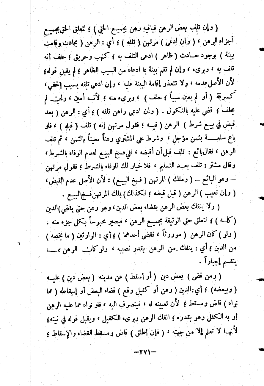 (وَإِنْ تَلِفَ بَعْضُ الرَّهْنِ فَبَاقِيهِ رَهْنٌ بِجَمِيعِ الْحَقِّ) ؛ لِتَعَلُّقِ الْحَقِّ بِجَمِيعِ أَجْزَاءِ الرَّهْنِ، (وَإِنْ ادَّعَى) مُرْتَهِنٌ (تَلَفَهُ) ؛ أَيْ: الرَّهْنِ (بِحَادِثٍ وَقَامَتْ بَيِّنَةٌ) بِوُجُودِ حَادِثٍ (ظَاهِرٍ) ادَّعَى التَّلَفَ بِهِ؛ كَنَهْبٍ وَحَرِيقٍ؛ حَلَفَ أَنَّهُ تَلِفَ بِهِ، وَبَرِئَ، وَإِنْ لَمْ تَقُمْ بَيِّنَةٌ بِمَا ادَّعَاهُ مِنْ السَّبَبِ الظَّاهِرِ؛ لَمْ يُقْبَلْ قَوْلُهُ؛ لِأَنَّ الْأَصْلَ عَدَمُهُ، وَلَا تَتَعَذَّرُ إقَامَةُ الْبَيِّنَةِ عَلَيْهِ، وَإِنْ ادَّعَى تَلَفَهُ بِسَبَبٍ خَفِيٍّ، كَسَرِقَةٍ (أَوْ لَمْ يُعَيِّنْ سَبَبًا؛ حَلَفَ) ، وَبَرِئَ مِنْهُ؛ لِأَنَّهُ أَمِينٌ، وَإِنْ لَمْ يَحْلِفْ؛ قُضِيَ عَلَيْهِ بِالنُّكُولِ.