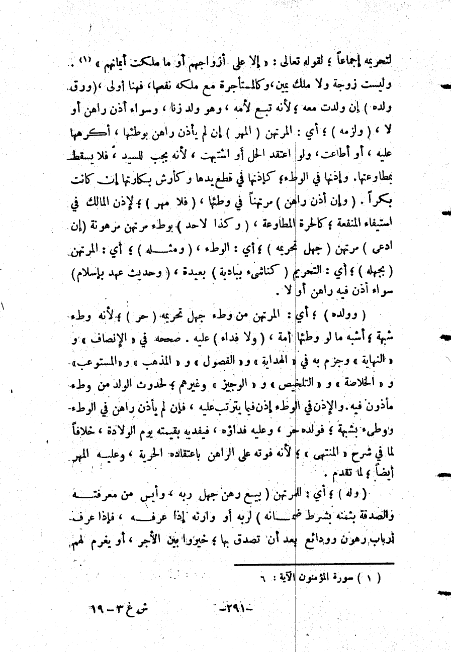 لِتَحْرِيمِهِ إجْمَاعًا؛ لِقَوْلِهِ تَعَالَى: {إِلا عَلَى أَزْوَاجِهِمْ أوْ مَا مَلَكَتْ أَيْمَانُهُمْ} [المؤمنون: 6] . وَلَيْسَتْ زَوْجَةً وَلَا مِلْكَ يَمِينٍ، وَكَالْمُسْتَأْجَرَةِ مَعَ مِلْكِهِ نَفْعَهَا، فَهُنَا أَوْلَى، (وَرُقَّ وَلَدُهُ) إنْ وَلَدَتْ مَعَهُ؛ لِأَنَّهُ تَبَعٌ لِأُمِّهِ، وَهُوَ وَلَدُ زِنًا، وَسَوَاءٌ أَذِنَ رَاهِنٌ أَوْ لَا، (وَلَزِمَهُ) ؛ أَيْ: الْمُرْتَهِنَ (الْمَهْرُ) إنْ لَمْ يَأْذَنْ رَاهِنٌ بِوَطْئِهَا، أَكْرَهَهَا عَلَيْهِ، أَوْ أَطَاعَتْ، وَلَوْ اعْتَقَدَ الْحِلَّ أَوْ اشْتَبَهَتْ، لِأَنَّهُ يَجِبُ لِلسَّيِّدِ، فَلَا يَسْقُطُ بِمُطَاوَعَتِهَا وَإِذْنِهَا فِي الْوَطْءِ؛ كَإِذْنِهَا فِي قَطْعِ يَدِهَا وَكَأَرْشِ بَكَارَتِهَا إنْ كَانَتْ بِكْرًا. (وَإِنْ أَذِنَ رَاهِنٌ) مُرْتَهِنًا فِي وَطْئِهَا، (فَلَا مَهْرَ) ؛ لِإِذْنِ الْمَالِكِ فِي اسْتِيفَاءِ الْمَنْفَعَةِ؛ كَالْحُرَّةِ الْمُطَاوِعَةِ، (وَكَذَا لَا حَدَّ) بِوَطْءِ مُرْتَهِنٍ مَرْهُونَةً (إنْ ادَّعَى) مُرْتَهِنٌ (جَهْلَ تَحْرِيمِهِ) ؛ أَيْ: الْوَطْءِ، (وَمِثْلُهُ) ؛ أَيْ: الْمُرْتَهِنِ (بِجَهْلِهِ) ؛ أَيْ: التَّحْرِيمِ (كَنَاشِئٍ بِبَادِيَةٍ) بَعِيدَةٍ، (وَحَدِيثِ عَهْدٍ بِإِسْلَامٍ) سَوَاءٌ أَذِنَ فِيهِ رَاهِنٌ أَوْ لَا. (وَوَلَدُهُ) ؛ أَيْ: الْمُرْتَهِنِ مِنْ وَطْءٍ جَهِلَ تَحْرِيمَهُ (حُرٌّ) ؛ لِأَنَّهُ وَطْءُ شُبْهَةٍ؛ أَشْبَهَ مَا لَوْ وَطِئَهَا أَمَةً، (وَلَا فِدَاءَ) عَلَيْهِ. صَحَّحَهُ فِي " الْإِنْصَافِ " " وَالنِّهَايَةِ " وَجَزَمَ بِهِ فِي " الْهِدَايَةِ " " وَالْفُصُولِ " " وَالْمُذَهَّبِ " " وَالْمُسْتَوْعِبِ " " وَالْخُلَاصَةِ " " وَالتَّلْخِيصِ " " وَالْوَجِيزِ " وَغَيْرِهِمْ؛ لِحُدُوثِ الْوَلَدِ مِنْ وَطْءٍ مَأْذُونٍ فِيهِ. وَالْإِذْنُ فِي الْوَطْءِ إذْنٌ فِيمَا يَتَرَتَّبُ عَلَيْهِ، فَإِنْ لَمْ يَأْذَنْ رَاهِنٌ فِي الْوَطْءِ وَوَطِئَ بِشُبْهَةٍ؛ فَوَلَدُهُ حُرٌّ، وَعَلَيْهِ فِدَاؤُهُ، فَيَفْدِيهِ بِقِيمَتِهِ يَوْمَ الْوِلَادَةِ، خِلَافًا لِمَا فِي شَرْحِ الْمُنْتَهَى "؛ لِأَنَّهُ فَوَّتَهُ عَلَى الرَّاهِنِ بِاعْتِقَادِهِ الْحُرِّيَّةَ، وَعَلَيْهِ الْمَهْرُ أَيْضًا؛ لِمَا تَقَدَّمَ.