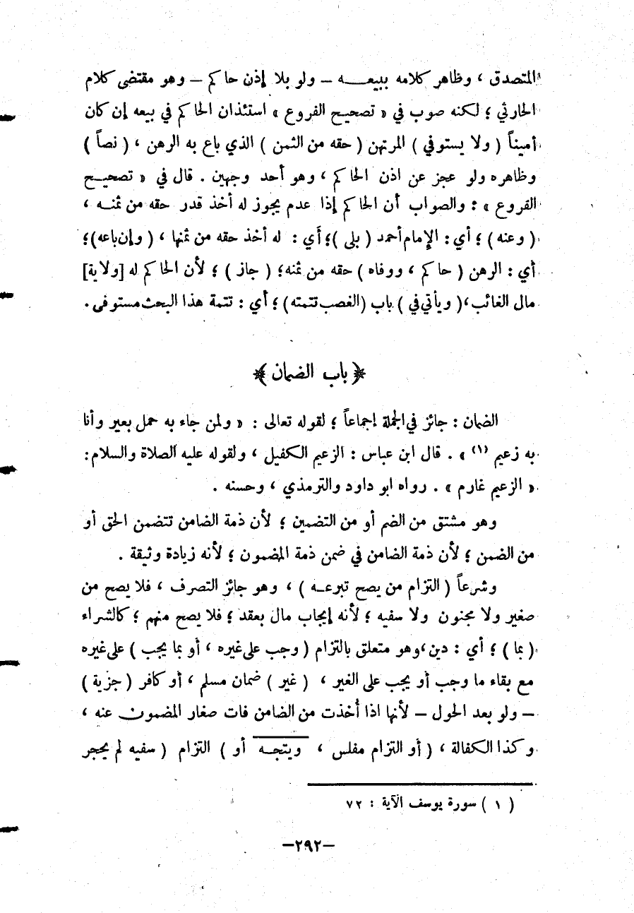 (بَابُ الضَّمَانِ) الضَّمَانُ: جَائِزٌ فِي الْجُمْلَةِ إجْمَاعًا؛ لِقَوْلِهِ تَعَالَى: {وَلِمَنْ جَاءَ بِهِ حِمْلُ بَعِيرٍ وَأَنَا بِهِ زَعِيمٌ} [يوسف: 72] ". قَالَ ابْنُ عَبَّاسٍ: الزَّعِيمُ الْكَفِيلُ، وَلِقَوْلِهِ - عَلَيْهِ الصَّلَاةُ وَالسَّلَامُ -: «الزَّعِيمُ غَارِمٌ» . رَوَاهُ أَبُو دَاوُد وَالتِّرْمِذِيُّ، وَحَسَّنَهُ. وَهُوَ مُشْتَقٌّ مِنْ الضَّمِّ أَوْ مِنْ التَّضْمِينِ؛ لِأَنَّ ذِمَّةَ الضَّامِنِ تَتَضَمَّنُ الْحَقَّ أَوْ مِنْ الضِّمْنِ؛ لِأَنَّ ذِمَّةَ الضَّامِنِ فِي ضِمْنِ ذِمَّةِ الْمَضْمُونِ؛ لِأَنَّهُ زِيَادَةُ وَثِيقَةٍ. وَشَرْعًا (الْتِزَامُ مَنْ يَصِحُّ تَبَرُّعُهُ) ، وَهُوَ جَائِزُ التَّصَرُّفِ، فَلَا يَصِحُّ مِنْ صَغِيرٍ وَلَا مَجْنُونٍ وَلَا سَفِيهٍ؛ لِأَنَّهُ إيجَابُ مَالٍ بِعَقْدٍ؛ فَلَا يَصِحُّ مِنْهُمْ؛ كَالشِّرَاءِ (بِمَا) ؛ أَيْ: دَيْنٍ، وَهُوَ مُتَعَلِّقٌ بِالْتِزَامٍ (وَجَبَ عَلَى غَيْرِهِ) ، (أَوْ بِمَا يَجِبُ) عَلَى غَيْرِهِ مَعَ بَقَاءِ مَا وَجَبَ أَوْ يَجِبُ عَلَى الْغَيْرِ، (غَيْرَ) ضَمَانِ مُسْلِمٍ، أَوْ كَافِرٍ (جِزْيَةٍ) - وَلَوْ بَعْدَ الْحَوْلِ - لِأَنَّهَا إذَا أُخِذَتْ مِنْ الضَّامِنِ فَاتَ صِغَارُ الْمَضْمُونِ عَنْهُ، وَكَذَا الْكَفَالَةُ، (أَوْ الْتِزَامُ مُفْلِسٍ، وَيَتَّجِهُ أَوْ) الْتِزَامُ (سَفِيهٍ لَمْ يُحْجَرْ