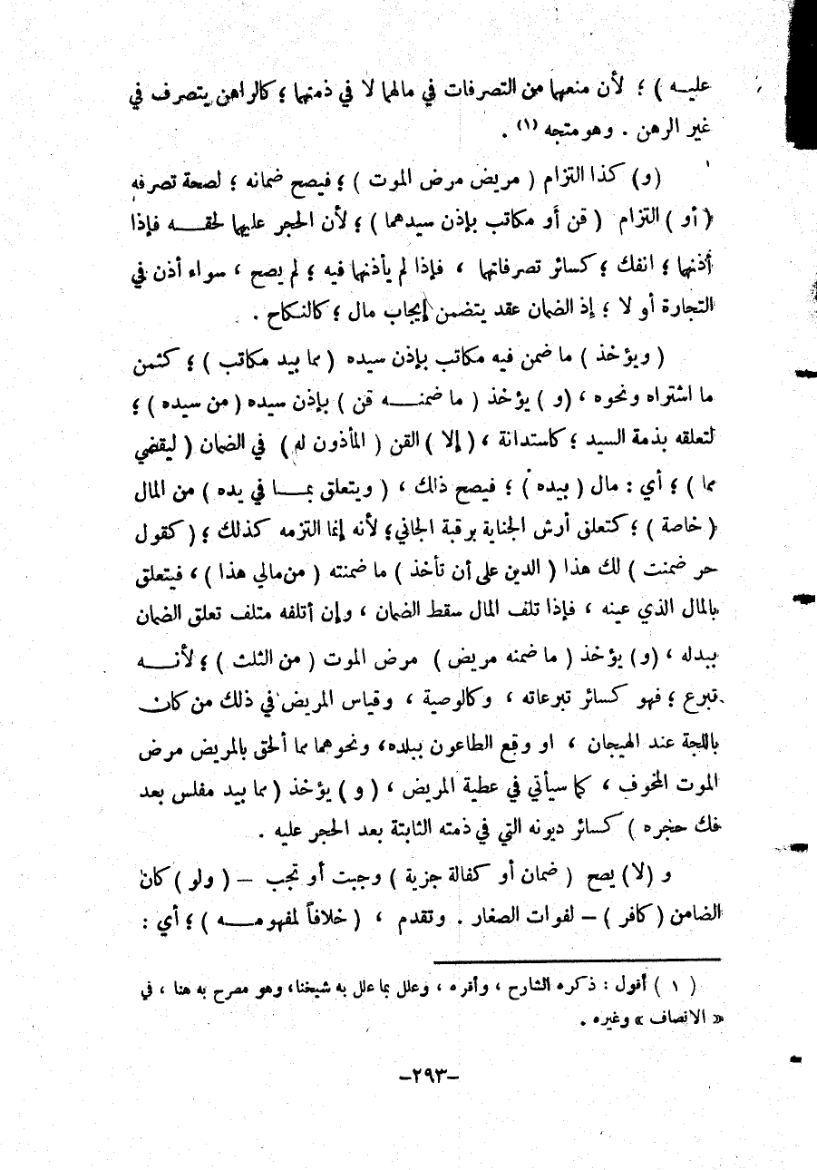 عَلَيْهِ) ؛ لِأَنَّ مَنْعَهُمَا مِنْ التَّصَرُّفَاتِ فِي مَالِهِمَا لَا فِي ذِمَّتِهِمَا؛ كَالرَّاهِنِ يَتَصَرَّفُ فِي غَيْرِ الرَّهْنِ. وَهُوَ مُتَّجِهٌ. (وَ) كَذَا الْتِزَامُ (مَرِيضٍ مَرَضَ الْمَوْتِ) ؛ فَيَصِحُّ ضَمَانُهُ؛ لِصِحَّةِ تَصَرُّفِهِ (أَوْ) الْتِزَامُ (قِنٍّ أَوْ مُكَاتَبٍ بِإِذْنِ سَيِّدِهِمَا) ؛ لِأَنَّ الْحَجْرَ عَلَيْهِمَا لِحَقِّهِ فَإِذَا أَذِنَهُمَا؛ انْفَكَّ؛ كَسَائِرِ تَصَرُّفَاتِهِمَا، فَإِذَا لَمْ يَأْذَنْهُمَا فِيهِ؛ لَمْ يَصِحَّ، سَوَاءٌ أَذِنَ فِي التِّجَارَةِ أَوْ لَا؛ إذْ الضَّمَانُ عَقْدٌ يَتَضَمَّنُ إيجَابَ مَالٍ؛ كَالنِّكَاحِ. (وَيُؤْخَذُ) مَا ضَمِنَ فِيهِ مُكَاتَبٌ بِإِذْنِ سَيِّدِهِ (مِمَّا بِيَدِ مُكَاتَبٍ) ؛ كَثَمَنِ مَا اشْتَرَاهُ وَنَحْوِهِ، (وَ) يُؤْخَذُ (مَا ضَمِنَهُ قِنٌّ) بِإِذْنِ سَيِّدِهِ (مِنْ سَيِّدِهِ) ؛ لِتَعَلُّقِهِ بِذِمَّةِ السَّيِّدِ؛ كَاسْتِدَانَةٍ، (إلَّا) الْقِنَّ (الْمَأْذُونَ لَهُ) فِي الضَّمَانِ (لِيَقْضِيَ مِمَّا) ؛ أَيْ: مَالٍ (بِيَدِهِ) ؛ فَيَصِحُّ ذَلِكَ، (وَيَتَعَلَّقُ بِمَا فِي يَدِهِ) مِنْ الْمَالِ (خَاصَّةً) ؛ كَتَعَلُّقِ أَرْشِ الْجِنَايَةِ بِرَقَبَةِ الْجَانِي؛ لِأَنَّهُ إنَّمَا الْتَزَمَهُ كَذَلِكَ؛ (كَقَوْلِ حُرٍّ ضَمِنْتُ) لَكَ هَذَا (الدَّيْنَ عَلَى أَنْ تَأْخُذَ) مَا ضَمِنْتُهُ (مِنْ مَالِي هَذَا) ، فَيَتَعَلَّقُ بِالْمَالِ الَّذِي عَيَّنَهُ، فَإِذَا تَلِفَ الْمَالُ سَقَطَ الضَّمَانُ، وَإِنْ أَتْلَفَهُ مُتْلِفٌ تَعَلَّقَ الضَّمَانُ بِبَدَلِهِ، (وَ) يُؤْخَذُ (مَا ضَمِنَهُ مَرِيضٌ) مَرَضَ الْمَوْتِ (مِنْ الثُّلُثِ) ؛ لِأَنَّهُ تَبَرُّعٌ؛ فَهُوَ كَسَائِرِ تَبَرُّعَاتِهِ، وَكَالْوَصِيَّةِ، وَقِيَاسُ الْمَرِيضِ فِي ذَلِكَ مَنْ كَانَ بِاللُّجَّةِ عِنْدَ الْهَيَجَانِ، أَوْ وَقَعَ الطَّاعُونُ بِبَلَدِهِ، وَنَحْوَهُمَا مِمَّا أَلْحَقَ بِالْمَرِيضِ مَرَضَ الْمَوْتِ الْمَخُوفَ، كَمَا سَيَأْتِي فِي عَطِيَّةِ الْمَرِيضِ. (وَ) يُؤْخَذُ (مِمَّا بِيَدِ مُفْلِسٍ بَعْدَ فَكِّ حَجْرِهِ) كَسَائِرِ دُيُونِهِ الَّتِي فِي ذِمَّتِهِ الثَّابِتَةِ بَعْدَ الْحَجْرِ عَلَيْهِ.