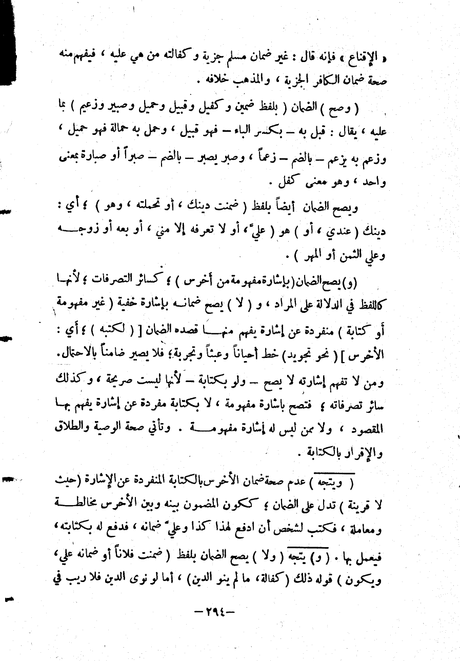 (وَ) يَصِحُّ الضَّمَانُ (بِإِشَارَةٍ مَفْهُومَةٍ مِنْ أَخْرَسَ) ؛ كَسَائِرِ التَّصَرُّفَاتِ؛ لِأَنَّهَا كَاللَّفْظِ فِي الدَّلَالَةِ عَلَى الْمُرَادِ، وَ (لَا) يَصِحُّ ضَمَانُهُ بِإِشَارَةٍ خَفِيَّةٍ (غَيْرِ مَفْهُومَةٍ أَوْ كِتَابَةٍ) مُنْفَرِدَةٍ عَنْ إشَارَةٍ يُفْهَمُ مِنْهَا قَصْدُهُ الضَّمَانَ [ (لِكَتْبِهِ) ؛ أَيْ: الْأَخْرَسِ] (نَحْوَ تَجْوِيدِ) خَطٍّ أَحْيَانًا وَعَبَثًا وَتَجْرِبَةً؛ فَلَا يَصِيرُ ضَامِنًا بِالِاحْتِمَالِ. وَمَنْ لَا تُفْهَمُ إشَارَتُهُ لَا يَصِحَّ - وَلَوْ بِكِتَابَةٍ - لِأَنَّهَا لَيْسَتْ صَرِيحَةً، وَكَذَلِكَ سَائِرُ تَصَرُّفَاتِهِ؛ فَتَصِحُّ بِإِشَارَةٍ مَفْهُومَةٍ، لَا بِكِتَابَةٍ مُفْرَدَةٍ عَنْ إشَارَةٍ يُفْهَمُ بِهَا الْمَقْصُودُ، وَلَا مِمَّنْ لَيْسَ لَهُ إشَارَةٌ مَفْهُومَةٌ. وَتَأْتِي صِحَّةُ الْوَصِيَّةِ وَالطَّلَاقِ وَالْإِقْرَارِ بِالْكِتَابَةِ. (وَيَتَّجِهُ) عَدَمُ صِحَّةِ ضَمَانِ الْأَخْرَسِ بِالْكِتَابَةِ الْمُنْفَرِدَةِ عَنْ الْإِشَارَةِ (حَيْثُ لَا قَرِينَةَ) تَدُلُّ عَلَى الضَّمَانِ؛ كَكَوْنِ الْمَضْمُونِ بَيْنَهُ وَبَيْنَ الْأَخْرَسِ مُخَالَطَةٌ وَمُعَامَلَةٌ، فَكَتَبَ لِشَخْصٍ أَنْ ادْفَعْ لِهَذَا كَذَا وَعَلَيَّ ضَمَانُهُ، فَدَفَعَ لَهُ بِكِتَابَتِهِ، فَيُعْمَلُ بِهَا.