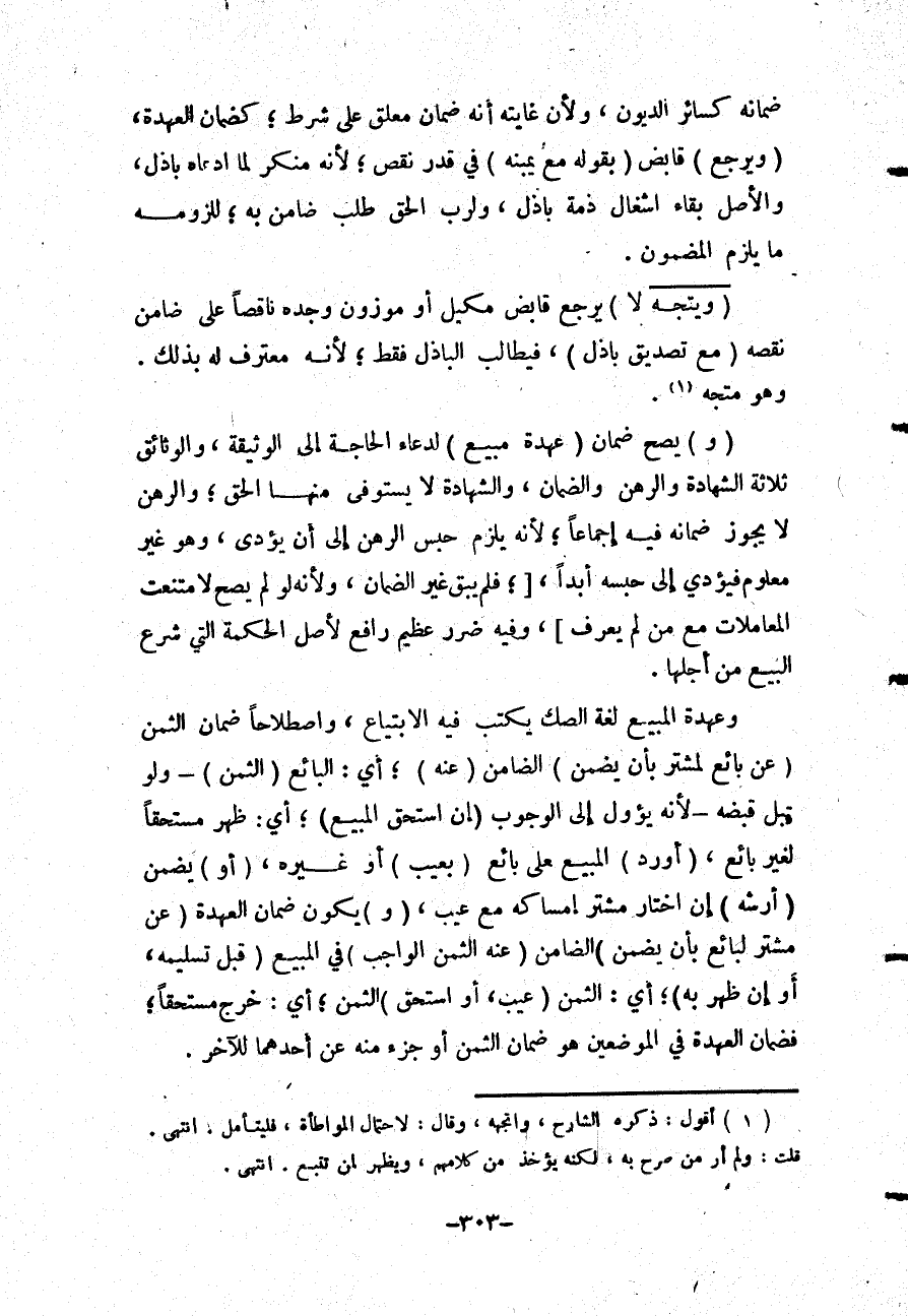 (وَ) يَصِحُّ ضَمَانُ (عُهْدَةِ مَبِيعٍ) لِدُعَاءِ الْحَاجَةِ إلَى الْوَثِيقَةِ، وَالْوَثَائِقُ ثَلَاثَةٌ: الشَّهَادَةُ وَالرَّهْنُ وَالضَّمَانُ، وَالشَّهَادَةُ لَا يُسْتَوْفَى مِنْهَا الْحَقُّ؛ وَالرَّهْنُ لَا يَجُوزُ ضَمَانُهُ فِيهِ إجْمَاعًا؛ لِأَنَّهُ يَلْزَمُ حَبْسُ الرَّهْنِ إلَى أَنْ يُؤَدَّى، وَهُوَ غَيْرُ مَعْلُومٍ فَيُؤَدِّي إلَى حَبْسِهِ أَبَدًا [؛ فَلَمْ يَبْقَ غَيْرُ الضَّمَانِ، وَلِأَنَّهُ لَوْ لَمْ يَصِحَّ لَامْتَنَعَتْ الْمُعَامَلَاتُ مَعَ مَنْ لَمْ يَعْرِفْ] ، وَفِيهِ ضَرَرٌ عَظِيمٌ رَافِعٌ لِأَصْلِ الْحِكْمَةِ الَّتِي شُرِعَ الْبَيْعُ مِنْ أَجْلِهَا.