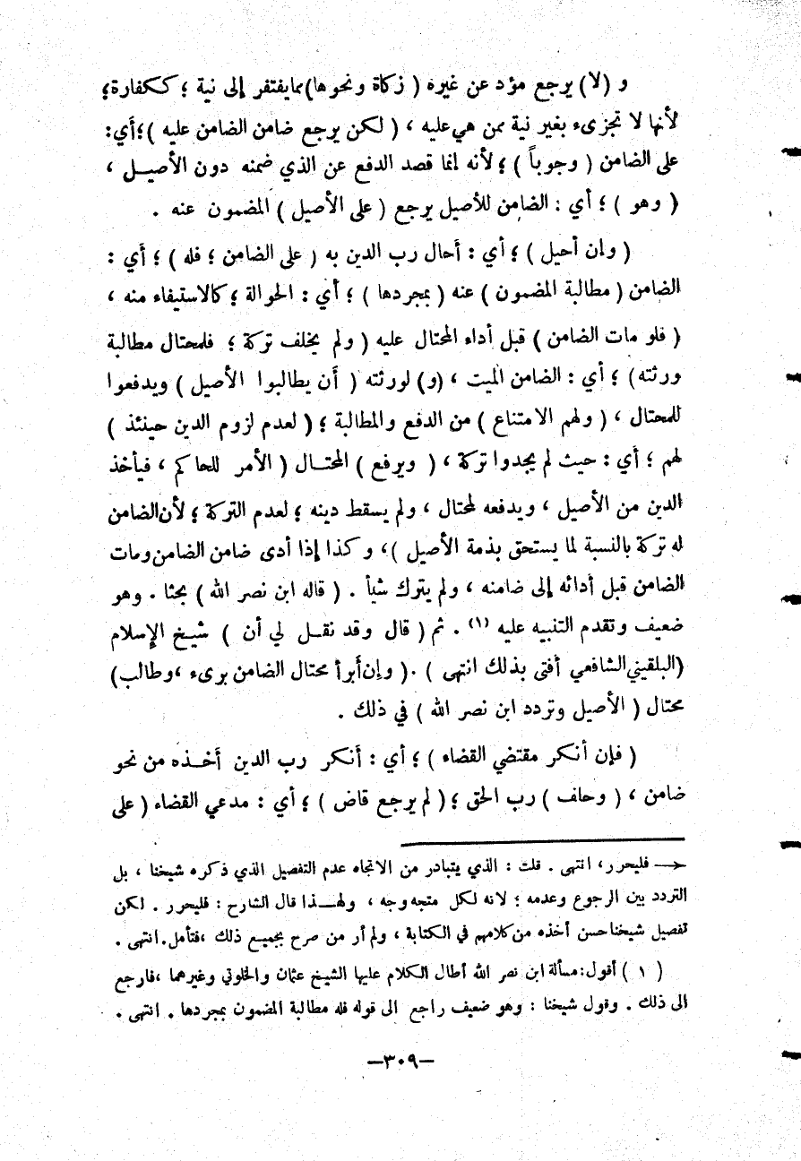 وَ (لَا) يَرْجِعُ مُؤَدٍّ عَنْ غَيْرِهِ (زَكَاةً وَنَحْوَهَا) مِمَّا يَفْتَقِرُ إلَى نِيَّةٍ؛ كَكَفَّارَةٍ؛ لِأَنَّهَا لَا تُجْزِئُ بِغَيْرِ نِيَّةٍ مِمَّنْ هِيَ عَلَيْهِ، (لَكِنْ يَرْجِعُ ضَامِنُ الضَّامِنِ عَلَيْهِ) ؛ أَيْ: عَلَى الضَّامِنِ (وُجُوبًا) ؛ لِأَنَّهُ إنَّمَا قَصَدَ الدَّفْعَ عَنْ الَّذِي ضَمِنَهُ دُونَ الْأَصِيلِ، (وَهُوَ) ؛ أَيْ: الضَّامِنُ لِلْأَصِيلِ يَرْجِعُ (عَلَى الْأَصِيلِ) الْمَضْمُونِ عَنْهُ.