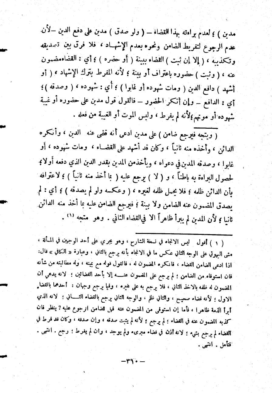 (وَيَتَّجِهُ فَيَرْجِعُ ضَامِنٌ) عَلَى مَدِينٍ ادَّعَى أَنَّهُ قَضَى عَنْهُ الدَّيْنَ، وَأَنْكَرَهُ الدَّائِنُ، وَأَخَذَهُ مِنْهُ ثَانِيًا، وَكَانَ قَدْ أَشْهَدَ عَلَى الْقَضَاءِ، وَمَاتَ شُهُودُهُ، أَوْ غَابُوا، وَصَدَّقَهُ الْمَدِينُ فِي دَعْوَاهُ، وَيَأْخُذُ مِنْ الْمَدِينِ بِقَدْرِ الدَّيْنِ الَّذِي دَفَعَهُ أَوَّلًا؛ لِحُصُولِ الْبَرَاءَةِ بِهِ بَاطِنًا، وَ (لَا) يَرْجِعُ عَلَيْهِ (بِمَا أَخَذَ مِنْهُ ثَانِيًا) ؛ لِاعْتِرَافِهِ بِأَنَّ الدَّائِنَ ظَلَمَهُ؛ فَلَا يَحْمِلُ ظُلْمَهُ لِغَيْرِهِ، (وَعَكْسُهُ وَلَوْ لَمْ يُصَدِّقْهُ) ؛ أَيْ: لَمْ يُصَدِّقْ الْمَضْمُونُ عَنْهُ الضَّامِنَ وَلَا بَيِّنَةَ؛ فَيَرْجِعُ الضَّامِنُ عَلَيْهِ بِمَا أَخَذَ مِنْهُ الدَّائِنُ ثَانِيًا؛ لِأَنَّ الْمَدِينَ لَمْ يَبْرَأْ ظَاهِرًا إلَّا فِي الْقَضَاءِ الثَّانِي وَهُوَ مُتَّجِهٌ.