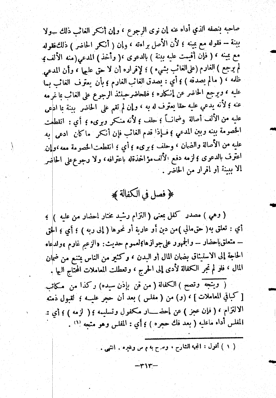 (فَصْلٌ فِي الْكَفَالَةِ) (وَهِيَ) مَصْدَرُ كَفَلَ بِمَعْنَى (الْتِزَامِ رَشِيدٍ مُخْتَارٍ إحْضَارَ مَنْ عَلَيْهِ) ؛ أَيْ: تَعَلَّقَ بِهِ (حَقٌّ مَالِيٌّ) مِنْ دَيْنٍ أَوْ عَارِيَّةٍ أَوْ نَحْوِهَا (إلَى رَبِّهِ) ؛ أَيْ؛ الْحَقِّ - مُتَعَلِّقٌ بِإِحْضَارٍ - وَالْجُمْهُورُ عَلَى جَوَازِهَا؛ لِعُمُومِ حَدِيثِ: «الزَّعِيمُ غَارِمٌ»