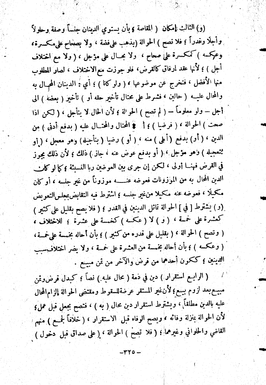 (وَ) الثَّالِثُ إمْكَانُ (الْمُقَاصَّةِ؛ بِأَنْ يَسْتَوِيَ الدَّيْنَانِ جِنْسًا وَصِفَةً وَحُلُولًا وَأَجَلًا وَقَدْرًا؛ فَلَا تَصِحُّ) الْحَوَالَةُ (بِذَهَبٍ عَلَى فِضَّةٍ، وَلَا بِصِحَاحٍ عَلَى مُكَسَّرَةٍ، وَعَكْسُهُ) كَمُكَسَّرَةٍ عَلَى صِحَاحٍ، وَلَا بِحَالٍّ عَلَى مُؤَجَّلٍ، (وَلَا مَعَ اخْتِلَافِ أَجَلٍ) ؛ لِأَنَّهَا عَقْدُ إرْفَاقٍ كَالْقَرْضِ، فَلَوْ جُوِّزَتْ مَعَ الِاخْتِلَافِ؛ لَصَارَ الْمَطْلُوبُ مِنْهَا الْأَفْضَلَ، فَتَخْرُجُ عَنْ مَوْضُوعِهَا، (وَلَوْ كَانَا) ؛ أَيْ: الدَّيْنَانِ الْمُحَالُ بِهِ وَالْمُحَالُ عَلَيْهِ (حَالَّيْنِ، فَشُرِطَ عَلَى مُحْتَالٍ تَأْخِيرُ حَقِّهِ أَوْ) تَأْخِيرُ (بَعْضِهِ) إلَى أَجَلٍ - وَلَوْ مَعْلُومًا - (لَمْ تَصِحَّ) الْحَوَالَةُ؛ لِأَنَّ الْحَالَّ لَا يَتَأَجَّلُ، (لَكِنْ إذَا صَحَّتْ) الْحَوَالَةُ، (فَرَضِيَا) ؛ أَيْ: الْمُحْتَالُ وَالْمُحْتَالُ عَلَيْهِ (بِدَفْعِ أَدْنَى) مِنْ الدَّيْنِ، (أَوْ) بِدَفْعِ (أَعْلَى) مِنْهُ، (أَوْ) رَضِيَا (بِتَأْجِيلِهِ) وَهُوَ مُعَجَّلٌ، (أَوْ تَعْجِيلِهِ) وَهُوَ مُؤَجَّلٌ، (أَوْ بِدَفْعِ عِوَضٍ عَنْهُ، جَازَ) ذَلِكَ؛ لِأَنَّ ذَلِكَ يَجُوزُ فِي الْقَرْضِ فَهُنَا أَوْلَى، لَكِنْ إنْ جَرَى بَيْنَ الْعِوَضَيْنِ رِبَا النَّسِيئَةِ كَمَا لَوْ كَانَ الدَّيْنُ الْمُحَالُ بِهِ مِنْ الْمَوْزُونَاتِ فَعِوَضُهُ عَنْهُ مَوْزُونًا مِنْ غَيْرِ جِنْسِهِ، أَوْ كَانَ مَكِيلًا، فَعِوَضُهُ عَنْهُ مَكِيلًا مِنْ غَيْرِ جِنْسِهِ؛ اشْتَرَطَ فِيهِ التَّقَابُضَ بِمَجْلِسِ التَّعْوِيضِ (وَ) يُشْتَرَطُ [فِي] الْحَوَالَةِ تَمَاثُلُ الدَّيْنَيْنِ فِي الْقَدْرِ؛ (فَلَا يَصِحُّ بِقَلِيلٍ عَلَى كَثِيرٍ) كَعَشَرَةٍ عَلَى خَمْسَةٍ، (وَ) لَا (عَكْسُهُ) كَخَمْسَةٍ عَلَى عَشَرَةٍ؛ لِلِاخْتِلَافِ، (وَتَصِحُّ) الْحَوَالَةُ، (بِقَلِيلٍ عَلَى قَدْرِهِ مِنْ كَثِيرٍ) ؛ بِأَنْ أَحَالَهُ بِخَمْسَةٍ عَلَى خَمْسَةٍ، (وَعَكْسُهُ) ؛ بِأَنْ أَحَالَهُ بِخَمْسَةٍ مِنْ الْعَشَرَةِ عَلَى خَمْسَةٍ، وَلَا يَضُرُّ اخْتِلَافُ سَبَبِ الدَّيْنَيْنِ؛ كَكَوْنِ أَحَدِهِمَا مِنْ قَرْضٍ وَالْآخَرِ مِنْ ثَمَنِ مَبِيعٍ.