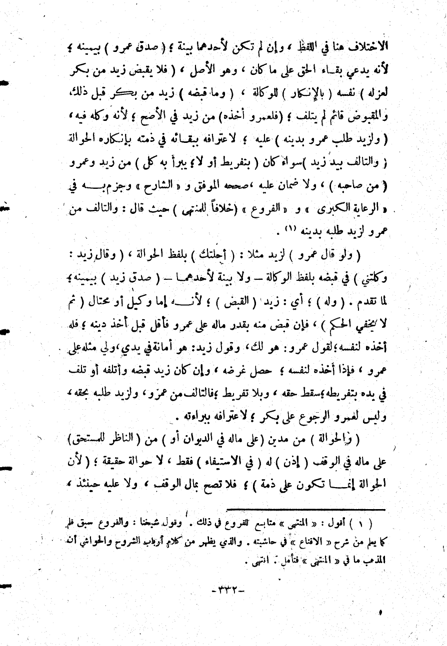 الِاخْتِلَافَ هُنَا فِي اللَّفْظِ، وَإِنْ لَمْ تَكُنْ لِأَحَدِهِمَا بَيِّنَةٌ؛ (صُدِّقَ عَمْرو) بِيَمِينِهِ؛ لِأَنَّهُ يَدَّعِي بَقَاءَ الْحَقِّ عَلَى مَا كَانَ، وَهُوَ الْأَصْلُ، (فَلَا يَقْبِضُ زَيْدٌ مِنْ بَكْرٍ لِعَزْلِهِ) نَفْسَهُ (بِالْإِنْكَارِ) لِلْوَكَالَةِ، (وَمَا قَبَضَهُ) زَيْدٌ مِنْ بَكْرٍ قَبْلَ ذَلِكَ وَالْمَقْبُوضُ قَائِمٌ لَمْ يَتْلَفْ؛ (فَلِعَمْرٍو أَخْذُهُ) مِنْ زَيْدٍ فِي الْأَصَحِّ؛ لِأَنَّهُ وَكَّلَهُ فِيهِ، (وَلِزَيْدٍ طَلَبُ عَمْرٍو بِدَيْنِهِ) عَلَيْهِ؛ لِاعْتِرَافِهِ بِبَقَائِهِ فِي ذِمَّتِهِ بِإِنْكَارِهِ الْحَوَالَةَ (وَالتَّالِفُ بِيَدِ زَيْدٍ) سَوَاءٌ كَانَ (بِتَفْرِيطٍ أَوْ لَا؛ يَبْرَأُ بِهِ كُلٌّ) مِنْ زَيْدٍ وَعَمْرٍو (مِنْ صَاحِبِهِ) ، وَلَا ضَمَانَ عَلَيْهِ، صَحَّحَهُ الْمُوَفَّقُ وَالشَّارِحُ وَجَزَمَ بِهِ فِي الرِّعَايَةِ الْكُبْرَى " " وَالْفُرُوعِ " (خِلَافًا لِلْمُنْتَهَى) حَيْثُ قَالَ: وَالتَّالِفُ مِنْ عَمْرٍو لِزَيْدٍ طَلَبُهُ بِدَيْنِهِ. .