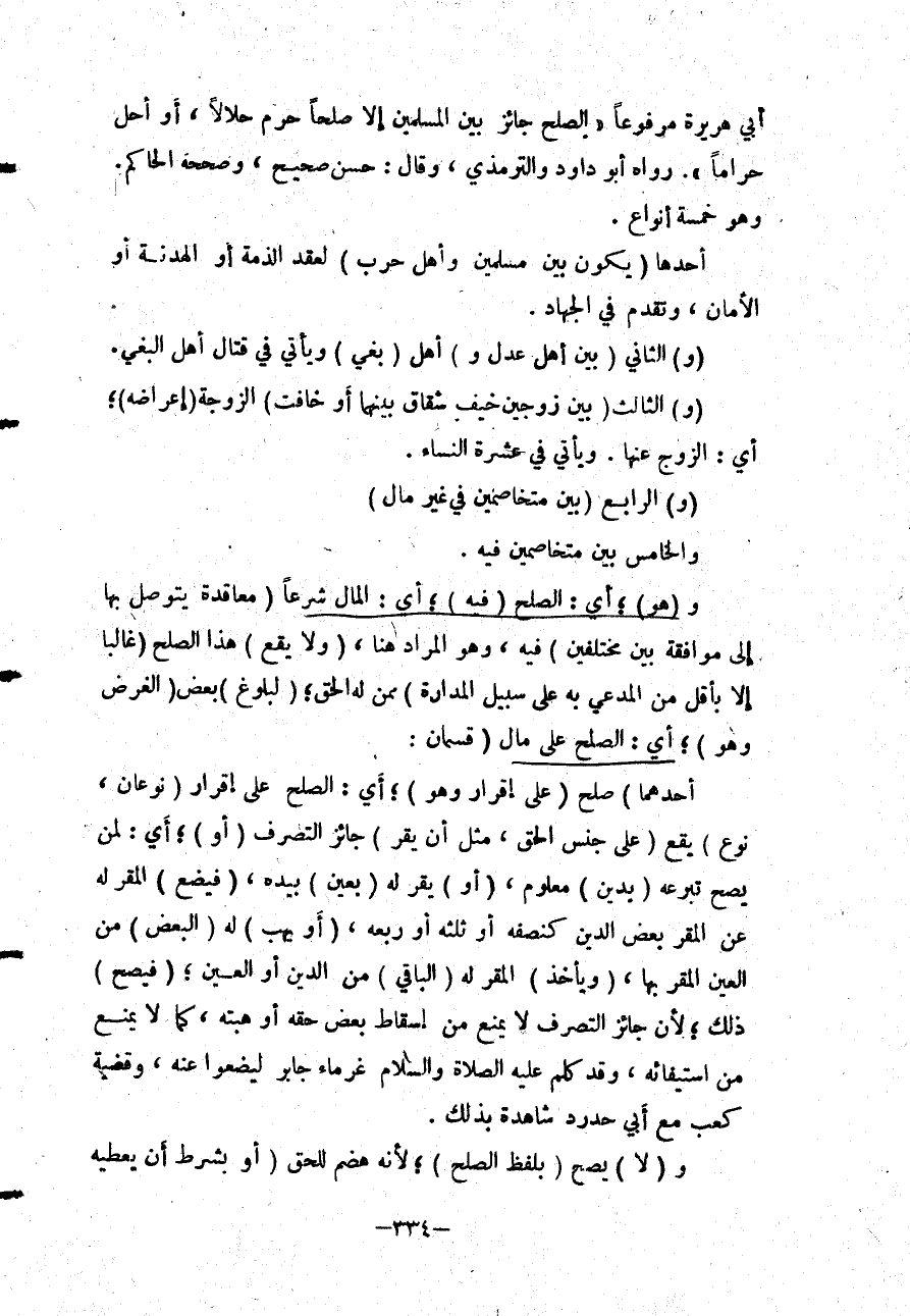 أَبِي هُرَيْرَةَ مَرْفُوعًا «الصُّلْحُ جَائِزٌ بَيْنَ الْمُسْلِمِينَ إلَّا صُلْحًا حَرَّمَ حَلَالًا، أَوْ أَحَلَّ حَرَامًا» رَوَاهُ أَبُو دَاوُد وَالتِّرْمِذِيُّ، وَقَالَ: حَسَنٌ صَحِيحٌ، وَصَحَّحَهُ الْحَاكِمُ.