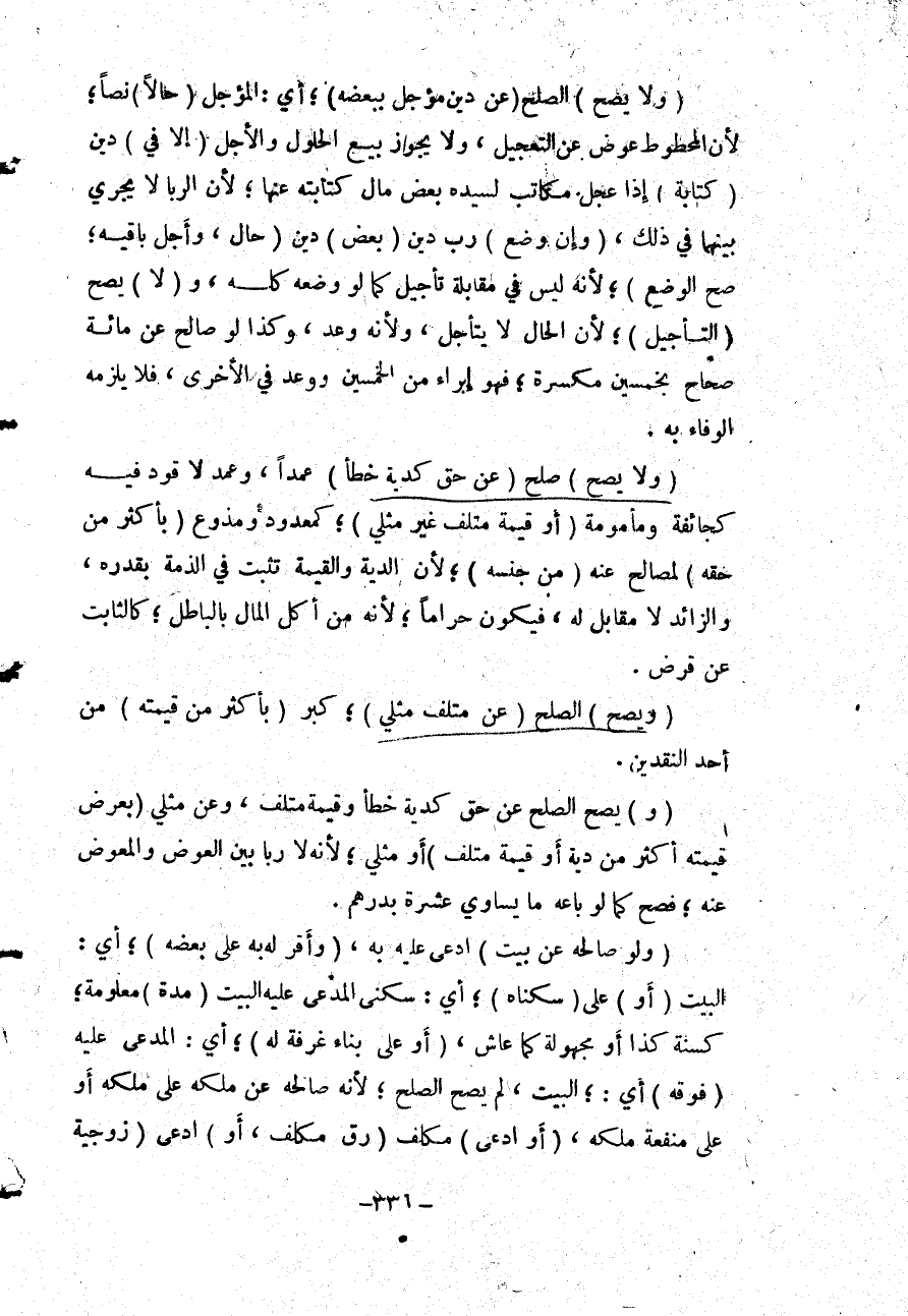 (وَلَا يَصِحُّ) صُلْحٌ (عَنْ حَقٍّ كَدِيَةٍ خَطَإٍ) عَمْدًا، وَعَمْدٍ لَا قَوْدَ فِيهِ كَجَائِفَةٍ وَمَأْمُومَةٍ (أَوْ قِيمَةِ مُتْلَفٍ غَيْرِ مِثْلِيٍّ) ؛ كَمَعْدُودٍ وَمَذْرُوعٍ (بِأَكْثَرَ مِنْ حَقِّهِ) لِمُصَالِحٍ عَنْهُ (مِنْ جِنْسِهِ) ؛ لِأَنَّ الدِّيَةَ وَالْقِيمَةَ تَثْبُتُ فِي الذِّمَّةِ بِقَدْرِهِ، وَالزَّائِدُ لَا مُقَابِلَ لَهُ، فَيَكُونُ حَرَامًا؛ لِأَنَّهُ مِنْ أَكْلِ الْمَالِ بِالْبَاطِلِ؛ كَالثَّابِتِ عَنْ قَرْضٍ