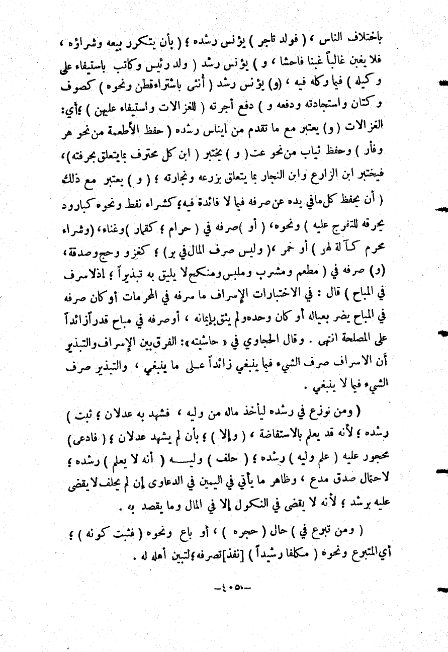 بِاخْتِلَافِ النَّاسِ، (فَوَلَدُ تَاجِرٍ) يُؤْنَسُ رُشْدُهُ؛ (بِأَنْ يَتَكَرَّرَ بَيْعُهُ وَشِرَاؤُهُ، فَلَا يَغْبِنُ غَالِبًا غَبْنًا فَاحِشًا، وَ) يُؤْنَسُ رُشْدُ (وَلَدِ رَئِيسٍ وَكَاتِبٍ بِاسْتِيفَاءٍ عَلَى وَكِيلِهِ) فِيمَا وَكَّلَهُ فِيهِ، (وَ) يُؤْنَسُ رُشْدُ (أُنْثَى بِاشْتِرَاءِ قُطْنٍ وَنَحْوِهِ) كَصُوفٍ وَكَتَّانٍ وَاسْتِجَادَتِهِ وَدَفْعِهِ (وَ) دَفْعِ أُجْرَتِهِ (لِلْغَزَّالَاتِ وَاسْتِيفَاءٍ عَلَيْهِنَّ) ؛ أَيْ: الْغَزَّالَاتِ (وَ) يُعْتَبَرُ مَعَ مَا تَقَدَّمَ مِنْ إينَاسِ رُشْدِهِ (حِفْظُ الْأَطْعِمَةِ مِنْ نَحْوِ هِرٍّ وَفَأْرٍ) وَحِفْظِ ثِيَابٍ مِنْ نَحْوِ عَتٍّ (وَ) يُخْتَبَرُ (ابْنُ كُلِّ مُحْتَرِفٍ بِمَا يَتَعَلَّقُ بِحِرْفَتِهِ) ، فَيُخْتَبَرُ ابْنُ الزَّارِعِ وَابْنُ النَّجَّارِ بِمَا يَتَعَلَّقُ بِزَرْعِهِ وَنِجَارَتِهِ؛ (وَ) يُعْتَبَرُ مَعَ ذَلِكَ (أَنْ يَحْفَظَ كُلَّ مَا فِي يَدِهِ عَنْ صَرْفِهِ فِيمَا لَا فَائِدَةَ فِيهِ؛ كَشِرَاءِ نِفْطٍ وَنَحْوِهِ كَبَارُودٍ يُحْرِقُهُ لِلتَّفَرُّجِ عَلَيْهِ) وَنَحْوِهِ، (أَوْ) صَرْفِهِ فِي (حَرَامٍ؛ كَقِمَارٍ) وَغِنَاءٍ، (وَشِرَاءِ مُحَرَّمٍ كَآلَةِ لَهْوٍ) أَوْ خَمْرٍ، (وَلَيْسَ صَرْفُ الْمَالِ فِي بِرٍّ) ؛ كَغَزْوٍ وَحَجٍّ وَصَدَقَةٍ، (وَ) صَرْفُهُ فِي (مَطْعَمٍ وَمَشْرَبٍ وَمَلْبَسٍ وَمَنْكَحٍ لَا يَلِيقُ بِهِ تَبْذِيرًا؛ إذْ لَا سَرَفَ فِي الْمُبَاحِ) قَالَ: فِي الِاخْتِيَارَاتِ الْإِسْرَافُ مَا صَرَفَهُ فِي الْمُحَرَّمَاتِ أَوْ كَانَ صَرْفُهُ فِي الْمُبَاحِ يَضُرُّ بِعِيَالِهِ أَوْ كَانَ وَحْدَهُ لَمْ يَثِقْ بِإِيمَانِهِ، أَوْ صَرَفَهُ فِي مُبَاحٍ قَدْرًا زَائِدًا عَلَى الْمَصْلَحَةِ انْتَهَى.