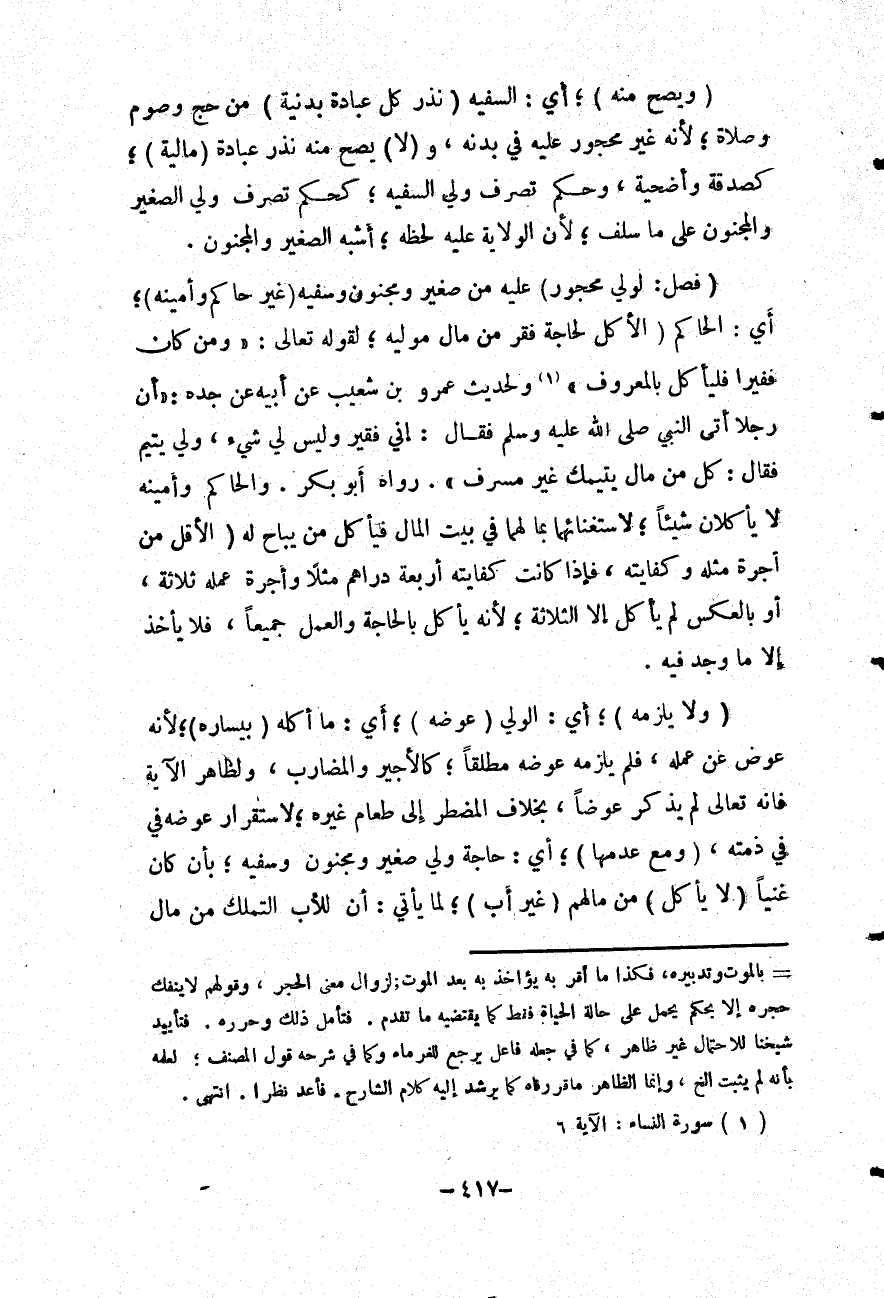 (فَصْلٌ: لِوَلِيٍّ مَحْجُورٍ) عَلَيْهِ مِنْ صَغِيرٍ وَمَجْنُونٍ وَسَفِيهٍ (غَيْرُ حَاكِمٍ وَأَمِينِهِ) ؛ أَيْ: الْحَاكِمِ الْأَكْلُ لِحَاجَةِ فَقْرٍ مِنْ مَالِ مُوَلِّيهِ؛ لِقَوْلِهِ تَعَالَى: {وَمَنْ كَانَ فَقِيرًا فَلْيَأْكُلْ بِالْمَعْرُوفِ} [النساء: 6] وَلِحَدِيثِ عَمْرِو بْنِ شُعَيْبٍ عَنْ أَبِيهِ عَنْ جَدِّهِ: «أَنَّ رَجُلًا أَتَى النَّبِيَّ - صَلَّى اللَّهُ عَلَيْهِ وَسَلَّمَ - فَقَالَ: إنِّي فَقِيرٌ وَلَيْسَ لِي شَيْءٌ، وَلِي يَتِيمٌ فَقَالَ: كُلْ مِنْ مَالِ يَتِيمِك غَيْرَ مُسْرِفٍ» . رَوَاهُ أَبُو بَكْرٍ. وَالْحَاكِمُ وَأَمِينُهُ لَا يَأْكُلَانِ شَيْئًا؛ لِاسْتِغْنَائِهِمَا بِمَا لَهُمَا فِي بَيْتِ الْمَالِ فَيَأْكُلُ مَنْ يُبَاحُ لَهُ الْأَقَلُّ مِنْ أُجْرَةِ مِثْلِهِ وَكِفَايَةٍ، فَإِذَا كَانَتْ كِفَايَتُهُ أَرْبَعَةَ دَرَاهِمَ مَثَلًا وَأُجْرَةُ عَمَلِهِ ثَلَاثَةٌ، أَوْ بِالْعَكْسِ لَمْ يَأْكُلْ إلَّا الثَّلَاثَةَ؛ لِأَنَّهُ يَأْكُلُ بِالْحَاجَةِ وَالْعَمَلِ جَمِيعًا، فَلَا يَأْخُذُ إلَّا مَا وَجَدَ فِيهِ.