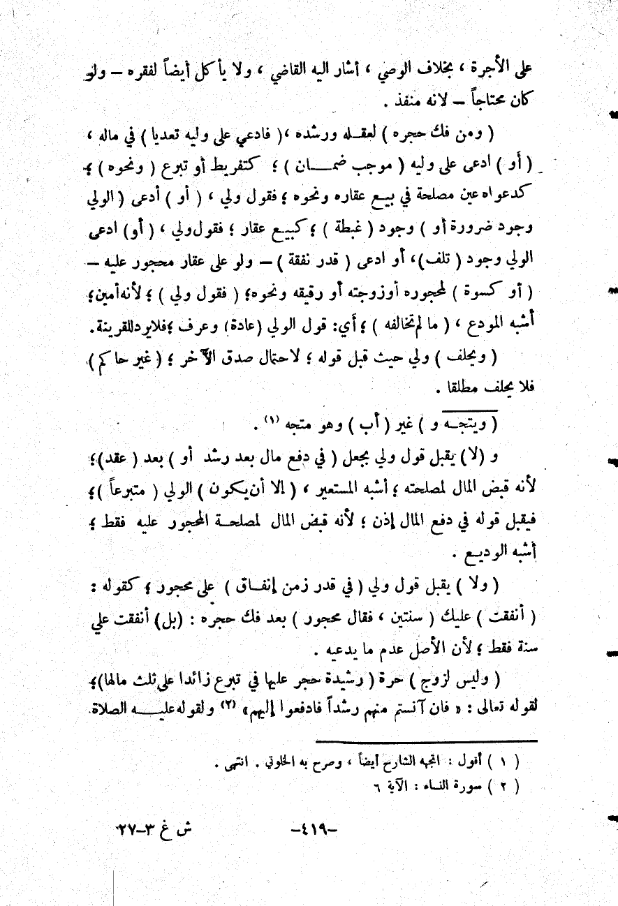 (وَمَنْ فُكَّ حَجْرُهُ) لِعَقْلِهِ وَرُشْدِهِ، (فَادَّعَى عَلَى وَلِيِّهِ تَعَدِّيًا) فِي مَالِهِ، (أَوْ) ادَّعَى عَلَى وَلِيِّهِ (مُوجَبَ ضَمَانٍ) ؛ كَتَفْرِيطٍ أَوْ تَبَرُّعٍ (وَنَحْوِهِ) ؛ كَدَعْوَاهُ عَيْنُ مَصْلَحَةٍ فِي بَيْعِ عَقَارِهِ وَنَحْوِهِ؛ فَقَوْلُ وَلِيٍّ، (أَوْ) ادَّعَى (الْوَلِيُّ وُجُودَ ضَرُورَةٍ أَوْ) وُجُودَ (غِبْطَةٍ) ؛ كَبَيْعِ عَقَارٍ؛ فَقَوْلُ وَلِيٍّ، (أَوْ) ادَّعَى الْوَلِيُّ وُجُودَ (تَلَفٍ) ، أَوْ ادَّعَى (قَدْرَ نَفَقَةٍ) - وَلَوْ عَلَى عَقَارٍ مَحْجُورٍ عَلَيْهِ - (أَوْ كِسْوَةٍ) لِمَحْجُورِهِ أَوْ زَوْجَتِهِ أَوْ رَقِيقِهِ وَنَحْوِهِ؛ (فَقَوْلُ وَلِيٍّ) ؛ لِأَنَّهُ أَمِينٌ؛ أَشْبَهَ الْمُودِعَ، (مَا لَمْ تُخَالِفْهُ) ؛ أَيْ: قَوْلَ الْوَلِيِّ (عَادَةٌ) : وَعُرْفٌ؛ فَلَا يُرَدُّ لِلْقَرِينَةِ.