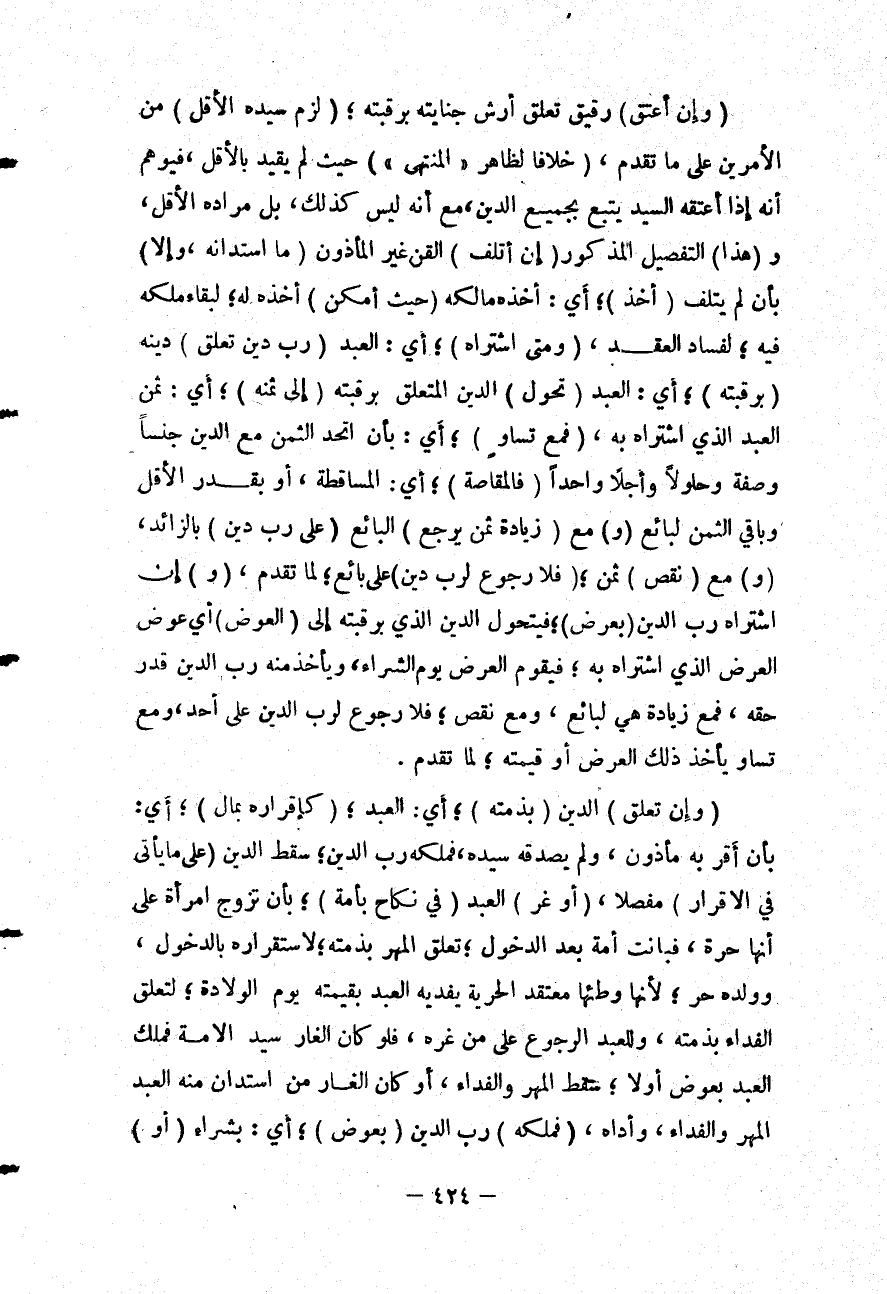 (وَإِنْ أَعْتَقَ) رَقِيقٌ تَعَلَّقَ أَرْشُ جِنَايَتِهِ بِرَقَبَتِهِ؛ (لَزِمَ سَيِّدَهُ الْأَقَلُّ) مِنْ الْأَمْرَيْنِ عَلَى مَا تَقَدَّمَ، (خِلَافًا لِظَاهِرِ " الْمُنْتَهَى ") حَيْثُ لَمْ يُقَيَّدْ بِالْأَقَلِّ، فَيُوهِمُ أَنَّهُ إذَا أَعْتَقَهُ السَّيِّدُ يُتَّبَعُ بِجَمِيعِ الدَّيْنِ، مَعَ أَنَّهُ لَيْسَ كَذَلِكَ، بَلْ مُرَادُهُ الْأَقَلُّ، و (هَذَا) التَّفْصِيلُ الْمَذْكُورُ (إنْ أَتْلَفَ) الْقِنُّ غَيْرُ الْمَأْذُونِ (مَا اسْتَدَانَهُ، وَإِلَّا) بِأَنْ لَمْ يَتْلَفْ (أَخَذَ) ؛ أَيْ: أَخَذَهُ مَالِكُهُ (حَيْثُ أَمْكَنَ) أَخْذُهُ لَهُ؛ لِبَقَاءِ مِلْكِهِ فِيهِ؛ لِفَسَادِ الْعَقْدِ.