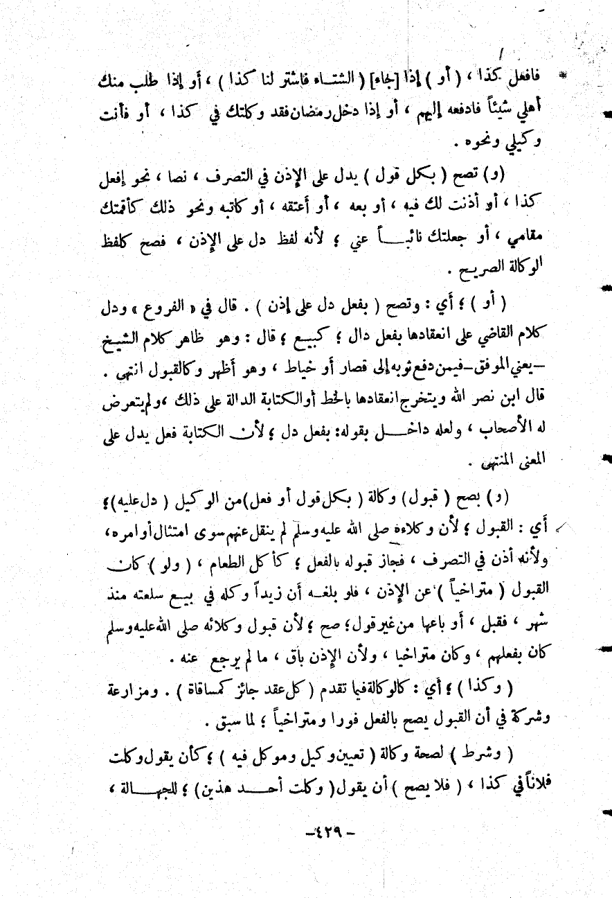 (وَ) تَصِحُّ (بِكُلِّ قَوْلٍ) يَدُلُّ عَلَى الْإِذْنِ فِي التَّصَرُّفِ، نَصًّا، نَحْوَ افْعَلْ كَذَا، أَوْ أَذِنْتُ لَك فِيهِ، أَوْ بِعْهُ، أَوْ اعْتِقْهُ، أَوْ كَاتِبْهُ وَنَحْوُ ذَلِكَ كَأَقَمْتُكَ مَقَامِي، أَوْ جَعَلْتُك نَائِبًا عَنِّي؛ لِأَنَّهُ لَفْظٌ دَلَّ عَلَى الْإِذْنِ، فَصَحَّ كَلَفْظِ الْوَكَالَةِ الصَّرِيحِ.