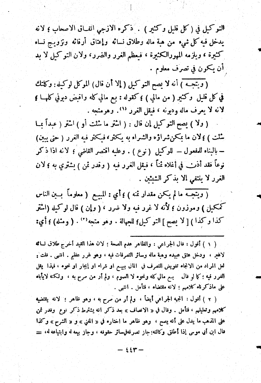 التَّوْكِيلُ فِي (كُلٍّ قَلِيلٍ وَكَثِيرٍ) . ذَكَرَهُ الْأَزَجِيُّ اتِّفَاقَ الْأَصْحَابِ؛ لِأَنَّهُ يَدْخُلُ فِيهِ كُلُّ شَيْءٍ مِنْ هِبَةِ مَالِهِ وَطَلَاقِ نِسَائِهِ وَإِعْتَاقِ أَرِقَّائِهِ وَتَزْوِيجِ نِسَاءٍ كَثِيرَةٍ، وَيَلْزَمُهُ الْمُهُورُ الْكَثِيرَةُ، فَيَعْظُمُ الْغُرُورُ وَالضَّرَرُ، وَلِأَنَّ التَّوْكِيلَ لَا بُدَّ أَنْ يَكُونَ فِي تَصَرُّفٍ مَعْلُومٍ.